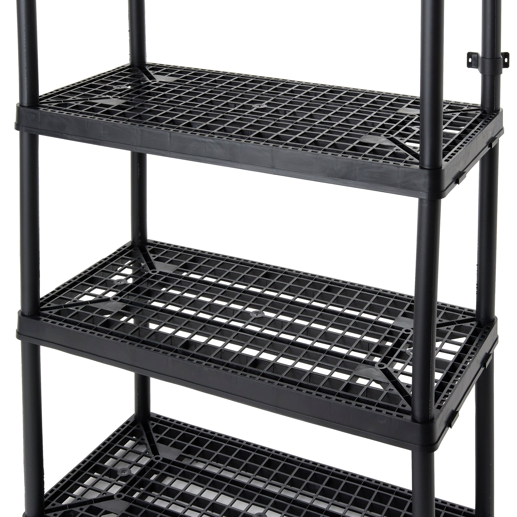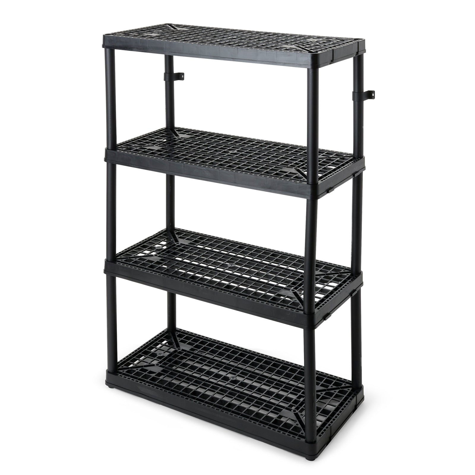 This bathroom storage shelf showcases timeless elegance for functional spaces with its lightweight, plastic construction and sleek color. Easily snap together for a simple installation process, and interconnect with additional units side-by-side for more storage space. Each ventilated shelf supports up to 150 pounds, providing a 600-pound unit capacity overall. Make sure that you distribute the weight evenly on the shelves for optimal, lasting use. With the 4 fixed shelves, you can organize laundry supplies, seasonal clothing items, home decor, toys, crafts, or tools. The closet storage shelf measures 18 inches long, 36 inches wide, and 54.5 inches tall offering a storage solution for any room. For added versatility, you can use the included brackets to mount the plastic shelves to the wall.