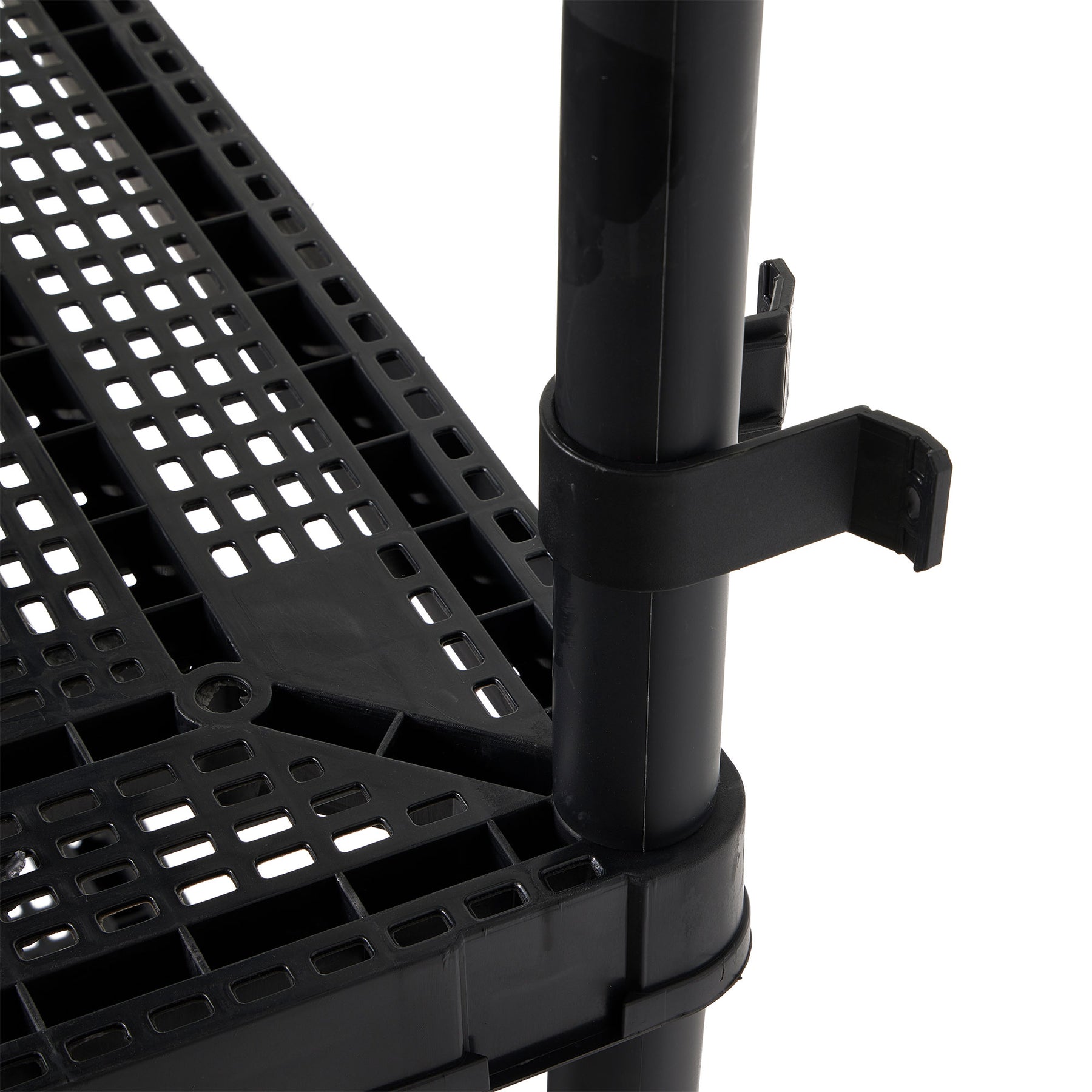 - Constructed from durable plastic, this utility rack resists rusting, denting, and peeling