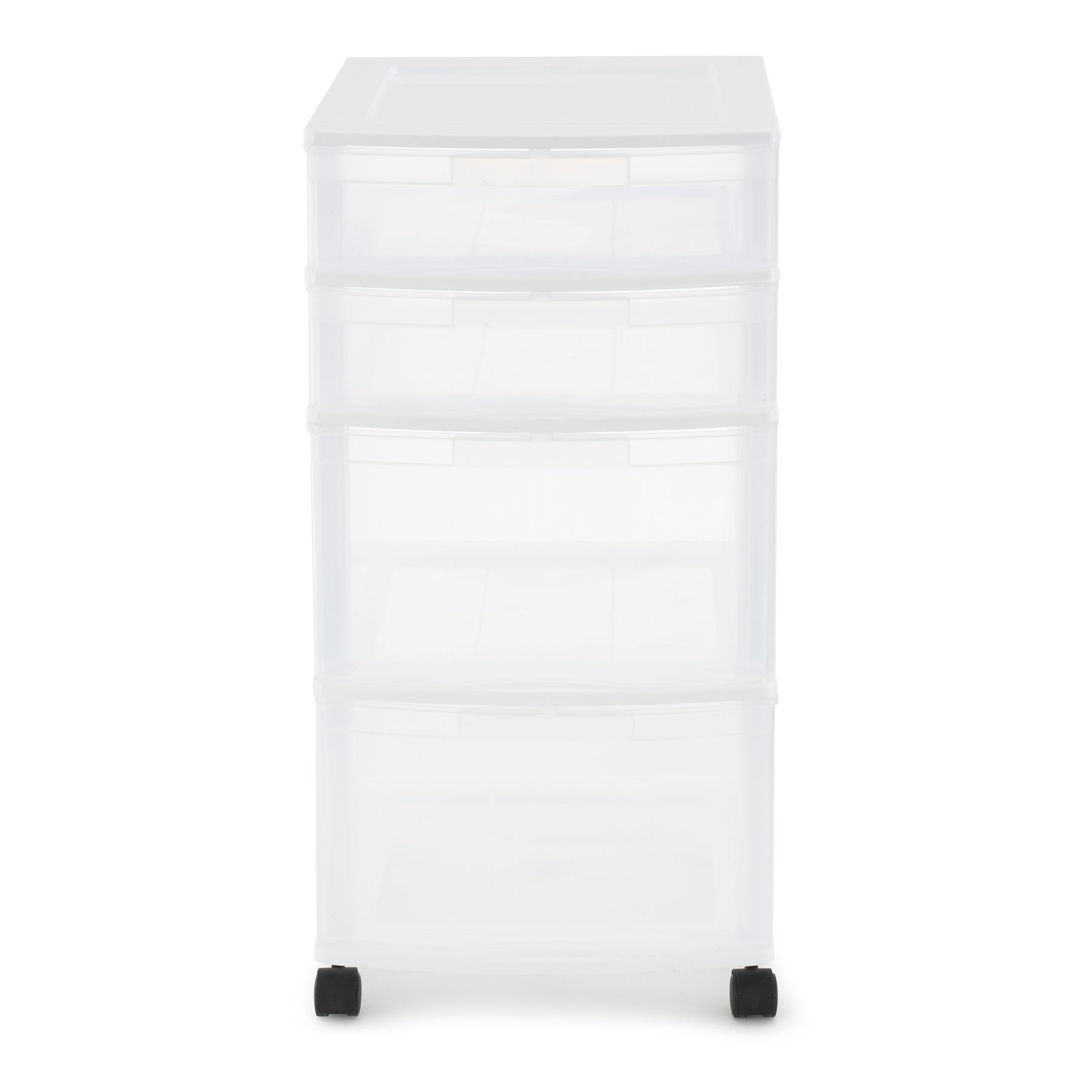 Keep your items organized in one spot with the Resin Clear 4 Drawer Storage Chest System with Casters from Gracious Living.