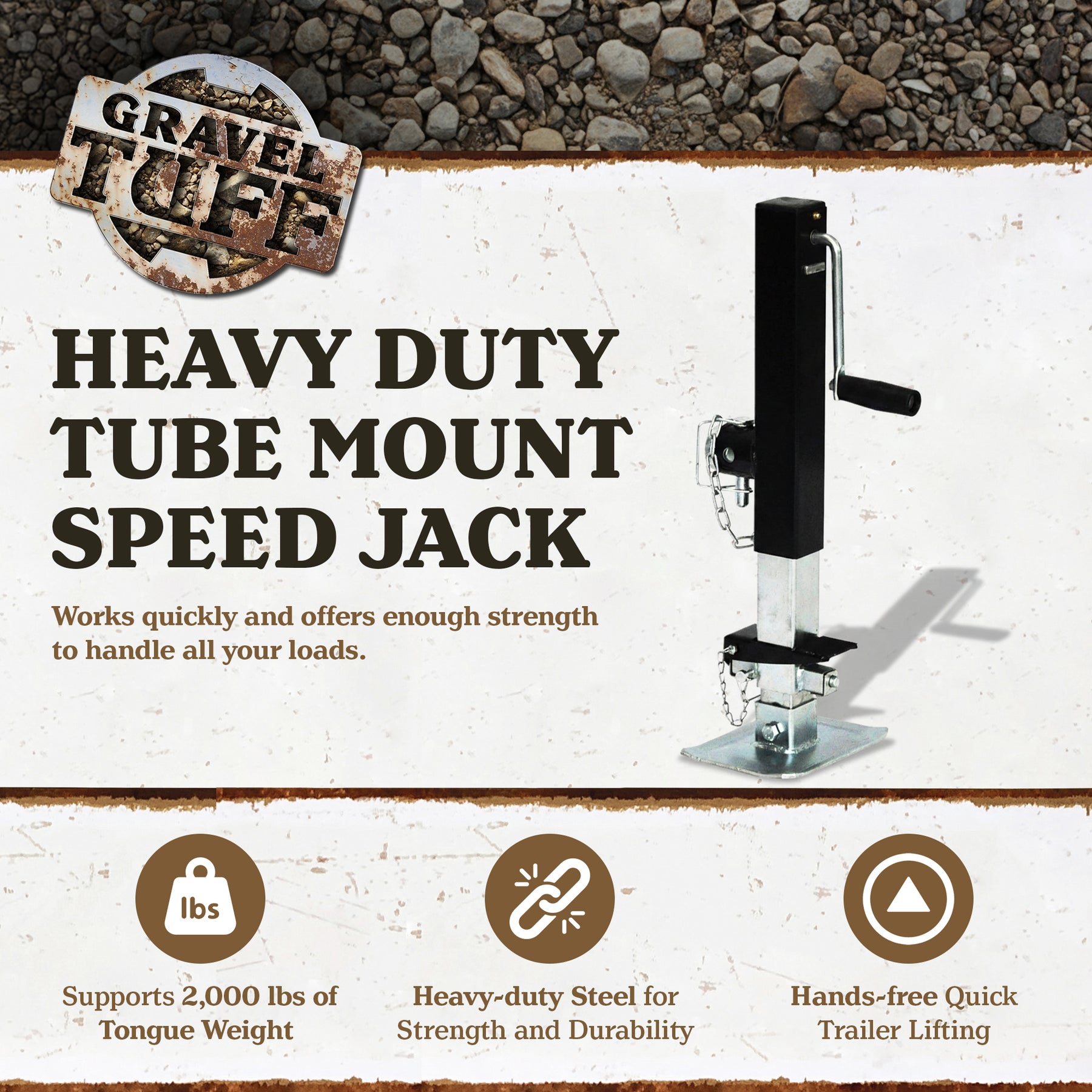 With a maximum tongue weight of 2,000 pounds, the jack helps you align and support your trailers for easy loading. Perfect for supporting your trailer, add the rugged strength of the Gravel Tuff Heavy Duty Speed Jack to your towing toolkit.