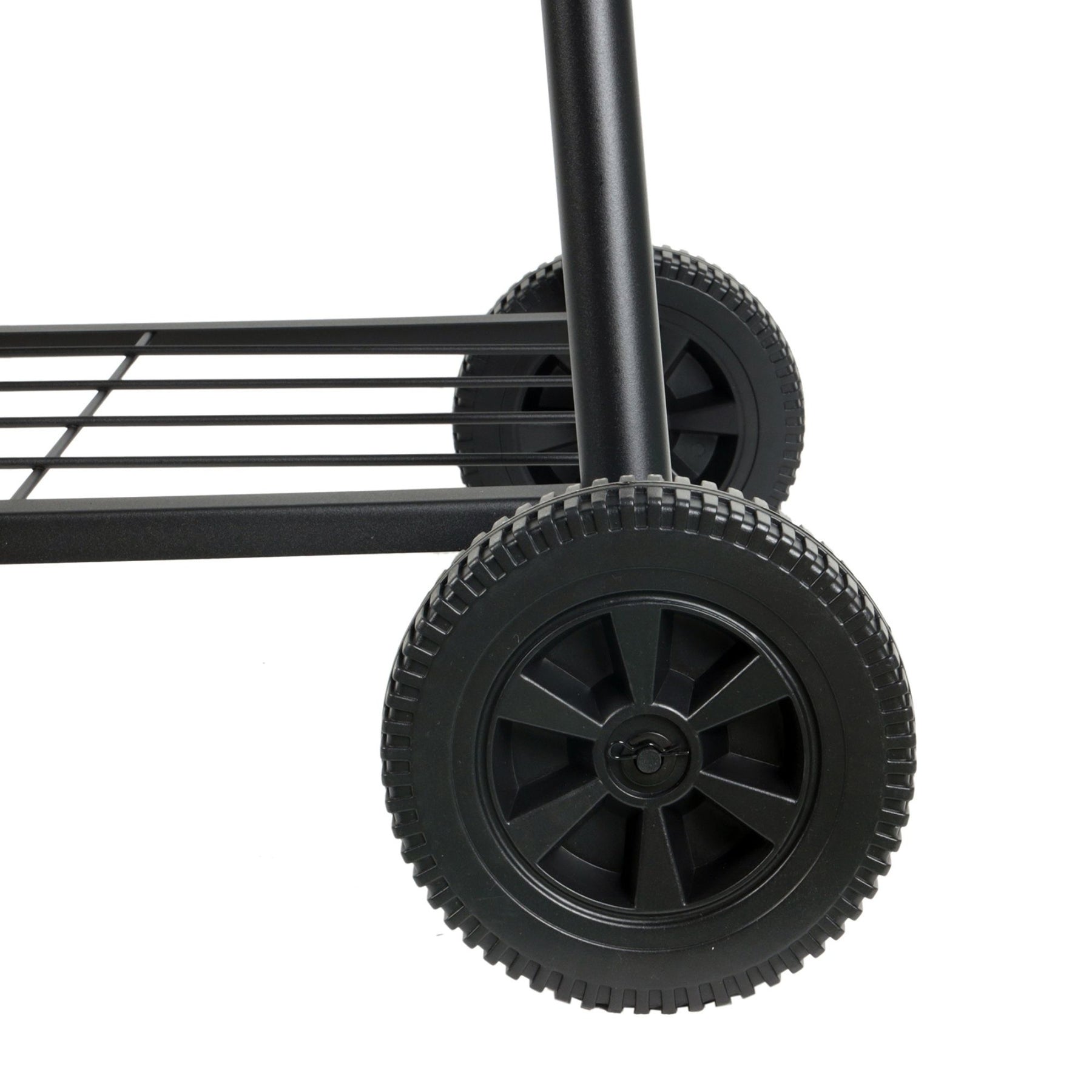 • Includes fixed side shelf for prep, bottom storage shelf for accessories, and wheels for easy mobility