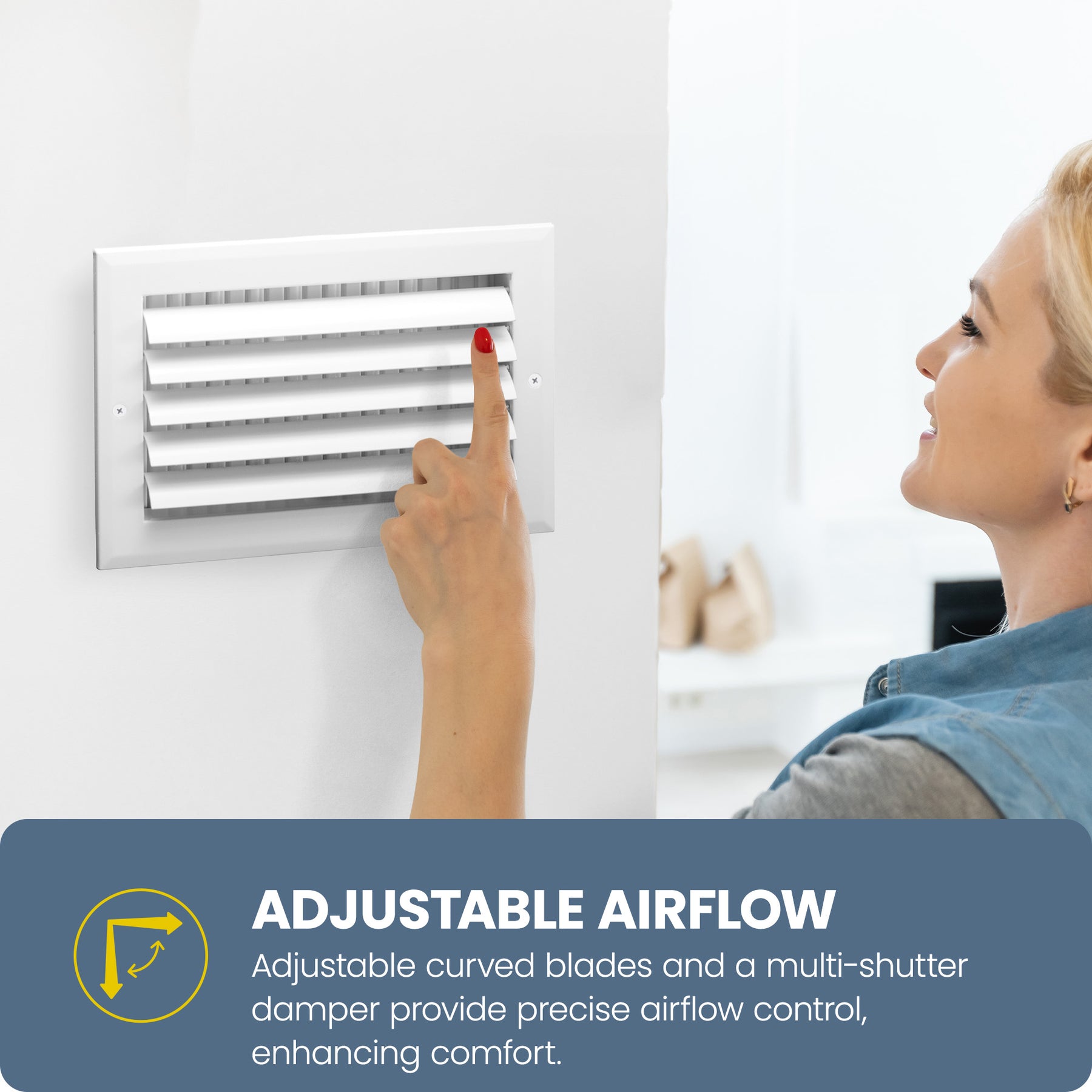 The standout feature of this register is its adjustable curved blades, which are specifically designed to increase deflection control. This allows for fine-tuned directional airflow, helping to create a more comfortable indoor environment by evenly distributing air across the room. With its four-way deflection and balanced four-way air pattern, it delivers consistent performance, reducing hot and cold spots and enhancing overall air circulation.