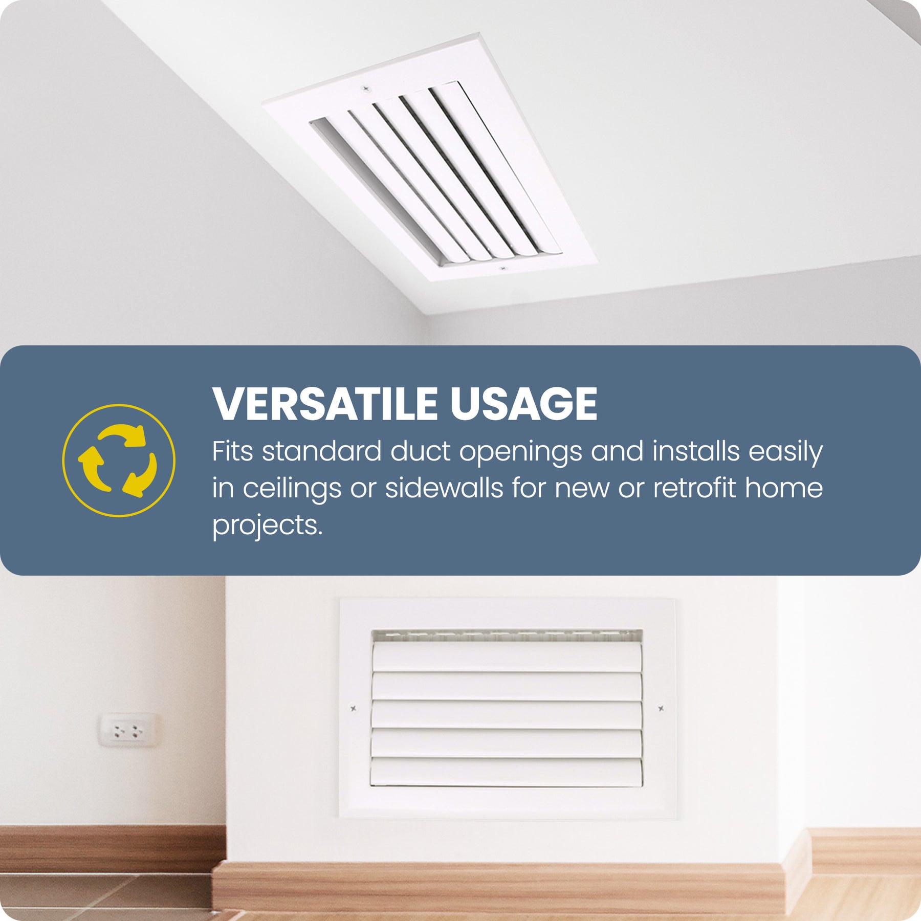 • Fits standard 10" x 10" duct openings and installs easily in both new construction and retrofit applications, offering flexibility for various room sizes and layouts and use in ceiling or sidewall installations