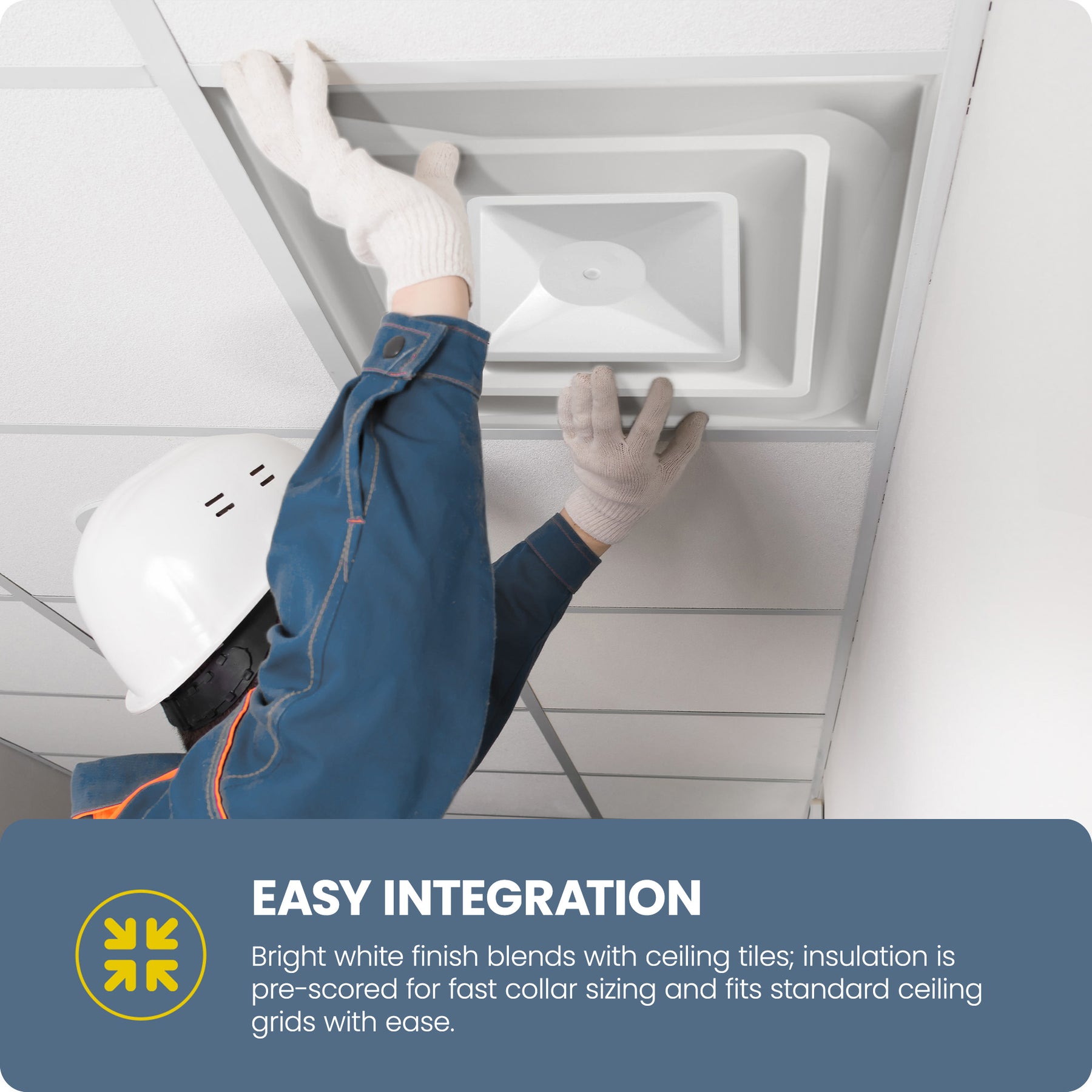 • Bright white finish blends with ceiling tiles; insulation is pre-scored for fast collar sizing and fits standard ceiling grids with ease