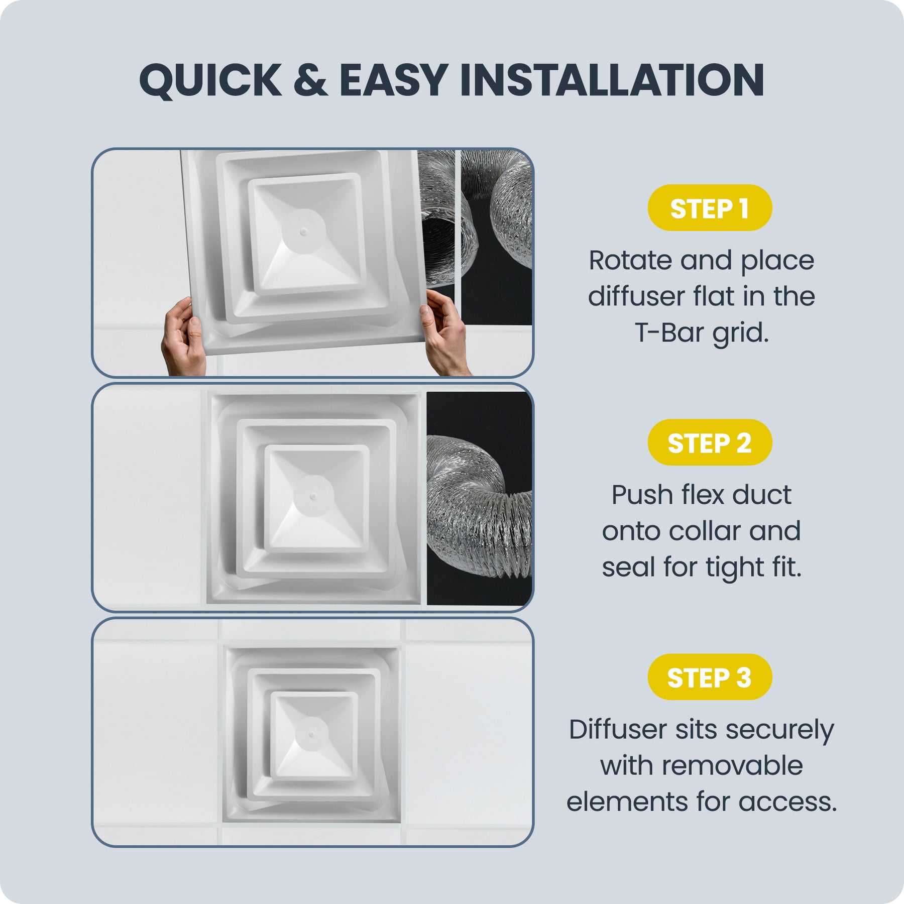 • Steel 4-way diffuser with 2-cone design and fixed 6" collar delivers 360-degree air diffusion for efficient, high-volume HVAC air distribution
