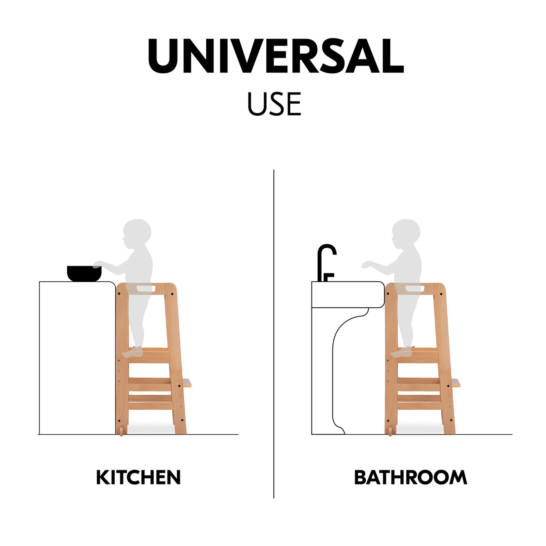 Built with sustainability and child development in mind, the learning tower is made from FSC-certified beechwood sourced from responsibly managed forests. Its minimalist design complements home furniture while serving as a functional, child-friendly tool inspired by Montessori principles. With the freedom to observe and participate, children naturally build their social, linguistic, and fine motor skills while learning through daily routines.