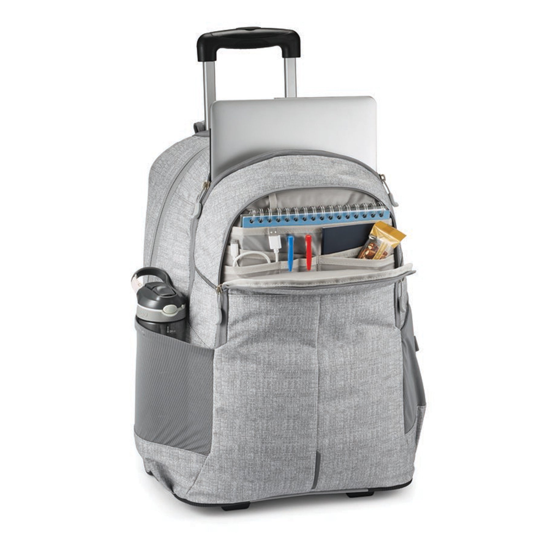 • Wheeled backpack with telescoping luggage handle and 360-degree reflectivity