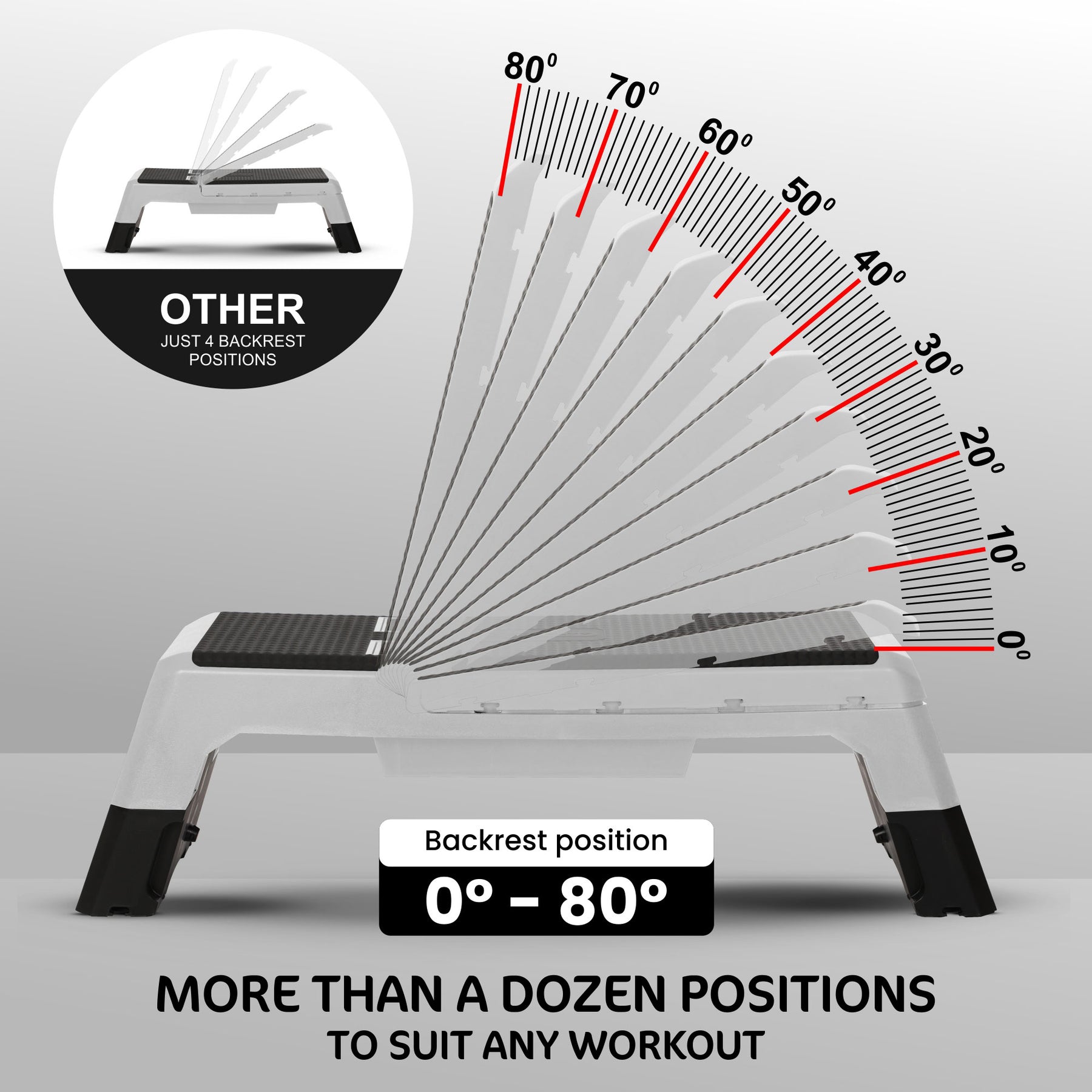 • Multifunctional aerobic deck with multiple backrest positions (0 degrees to 80 degrees), 2 height levels (8.5 inches and 14.5 inches), and 3 postures (flat, incline, decline)