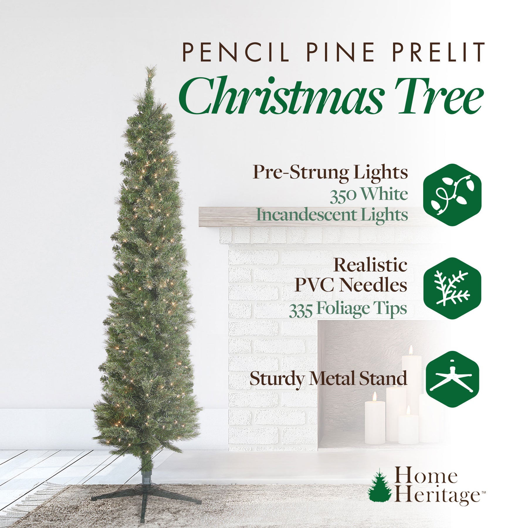 - This holiday bundle includes a high-quality rotating Christmas tree stand and the Home Heritage Stanley Skinny Pencil Pine Pre-Lit Artificial Christmas Tree