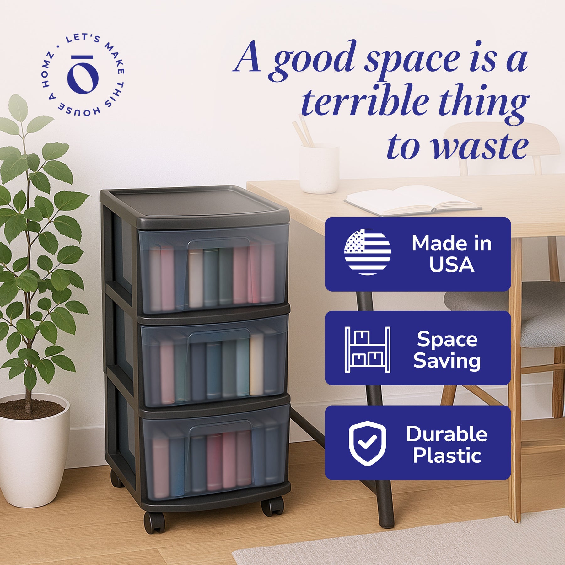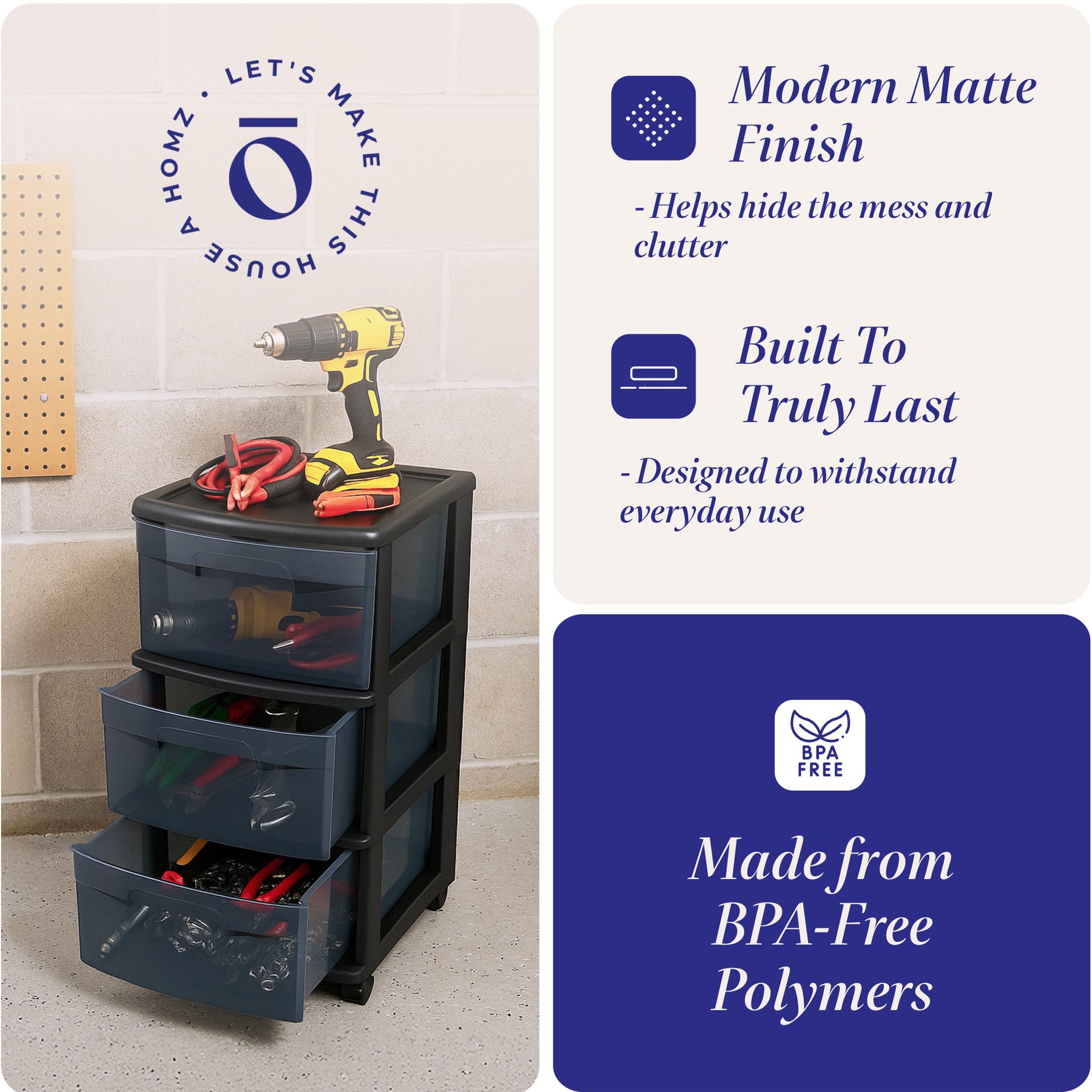 Homz 25" Black Tall Solid Plastic 3 Drawer Wheeled Home Storage Organizer Cart