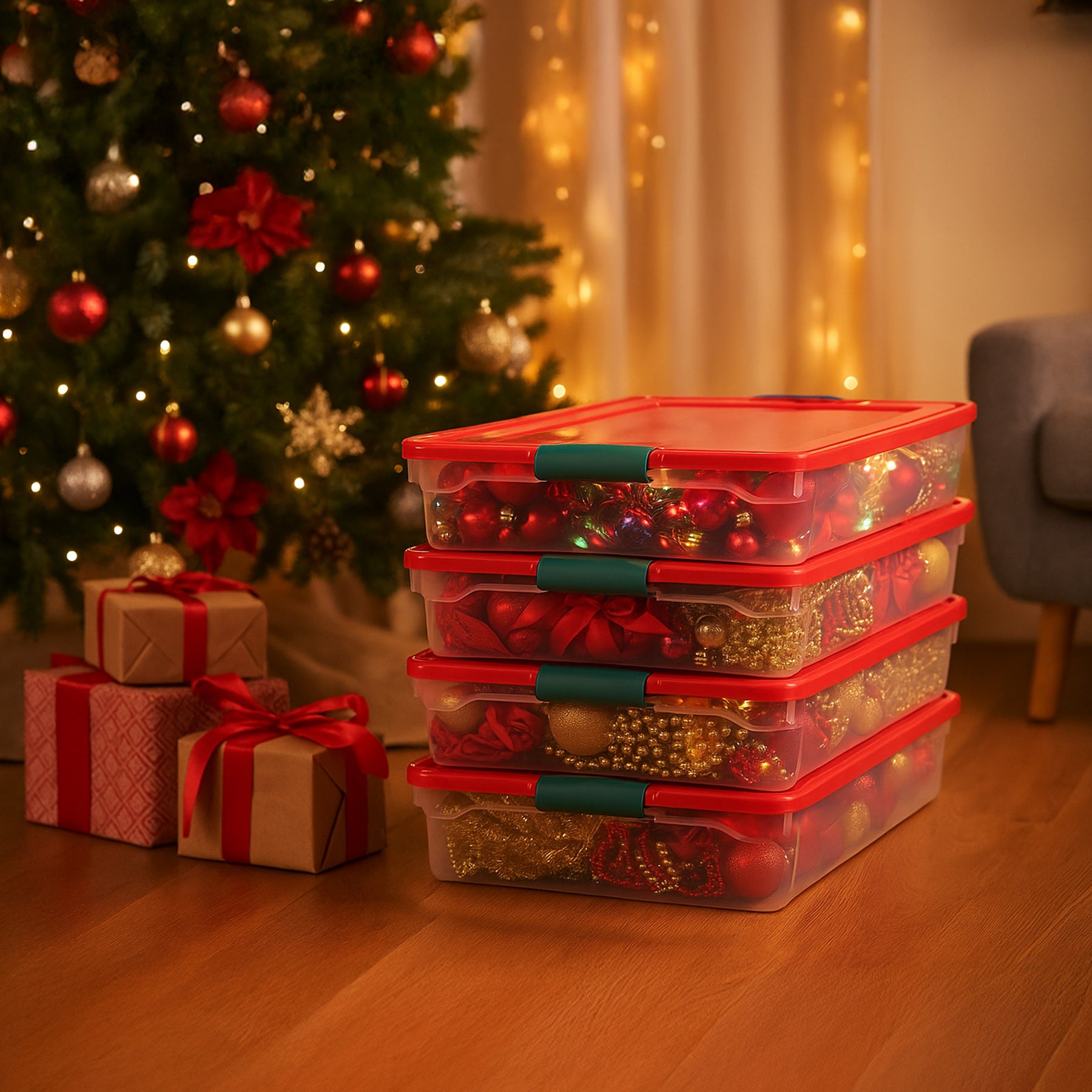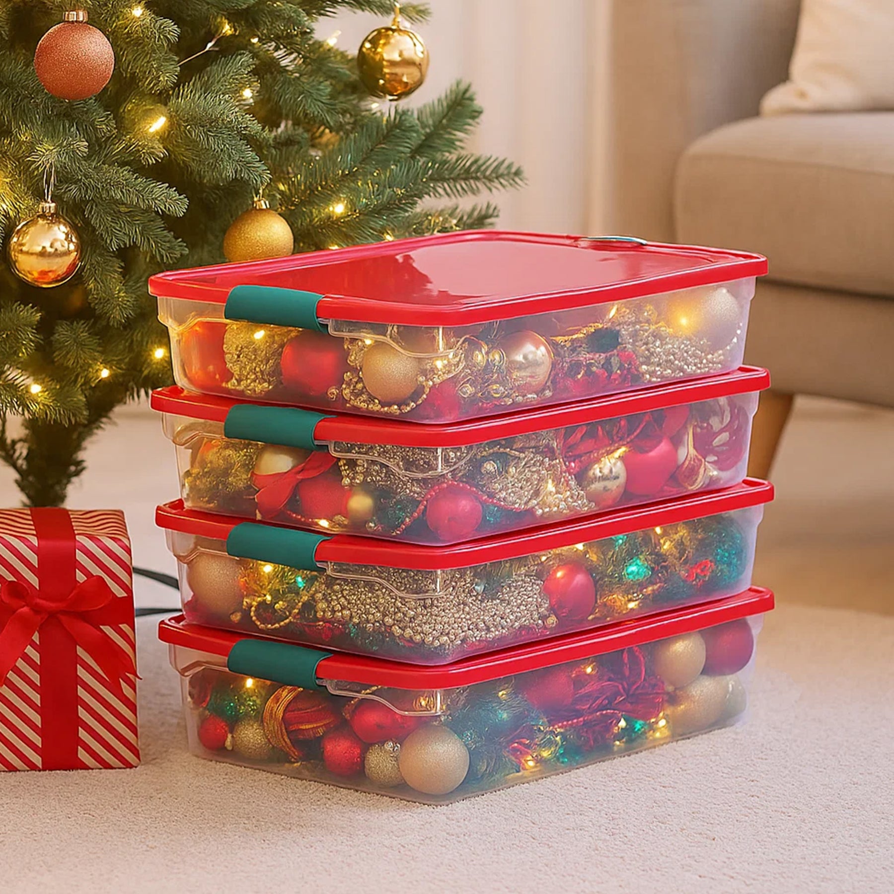Save yourself from the stress that comes with constant mess with the 4-pack of HOMZ 60-Quart Latching Holiday Underbed Storage Containers.