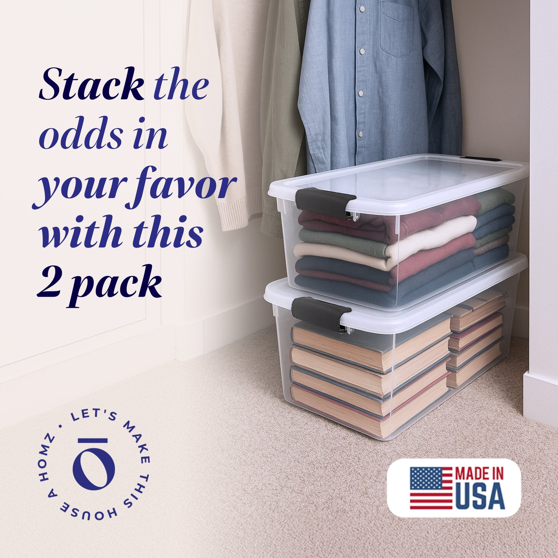 • Multipurpose 66-quart capacity totes are ideal for storing clothing items, seasonal holiday decorations and other large items around your home