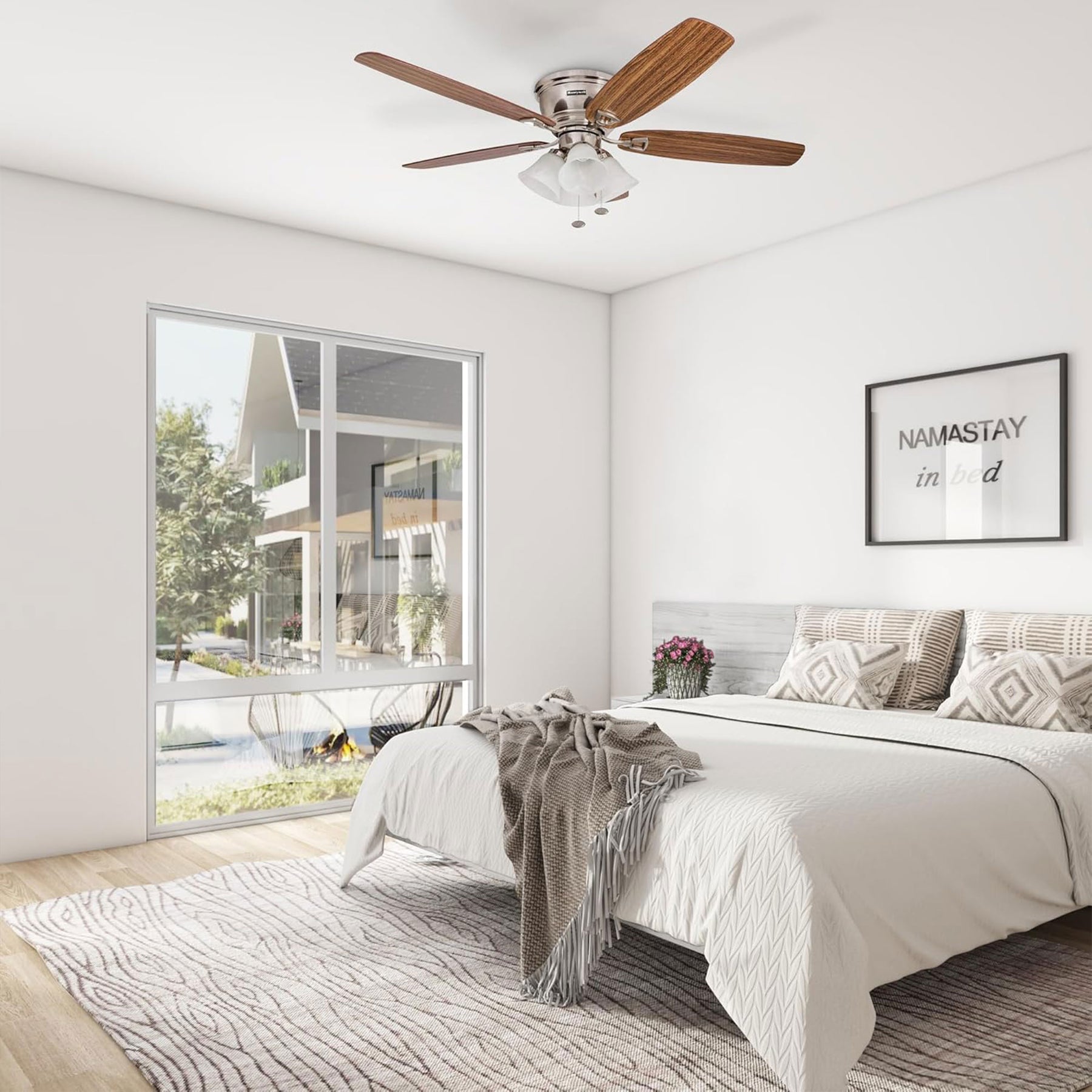Enjoy year-round comfort with the quiet, reversible 3-speed motor, which provides strong airflow during summer months and helps redistribute warm air in winter for improved energy efficiency. Operation is simple with dual pull chain controls for fan speed and lighting, and it’s compatible with most universal remotes (sold separately).