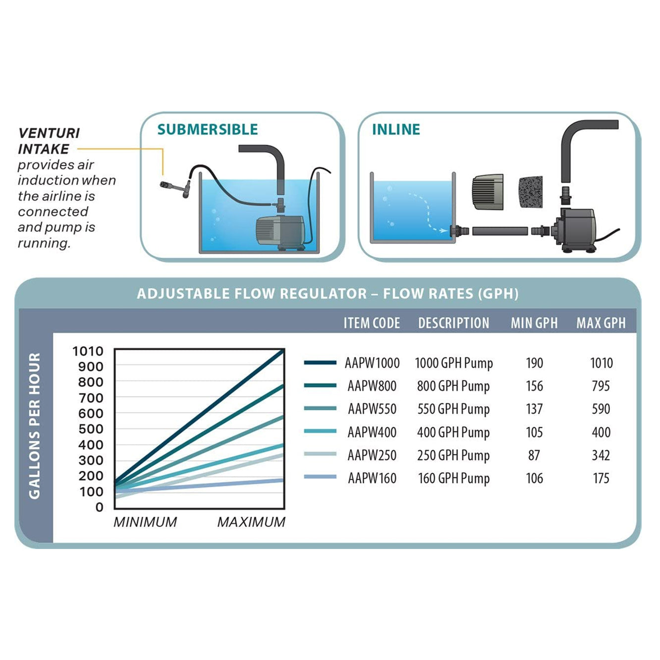 • This indoor/outdoor submersible water pump is recommended for 80-gallon reservoirs; 800 gallons per hour