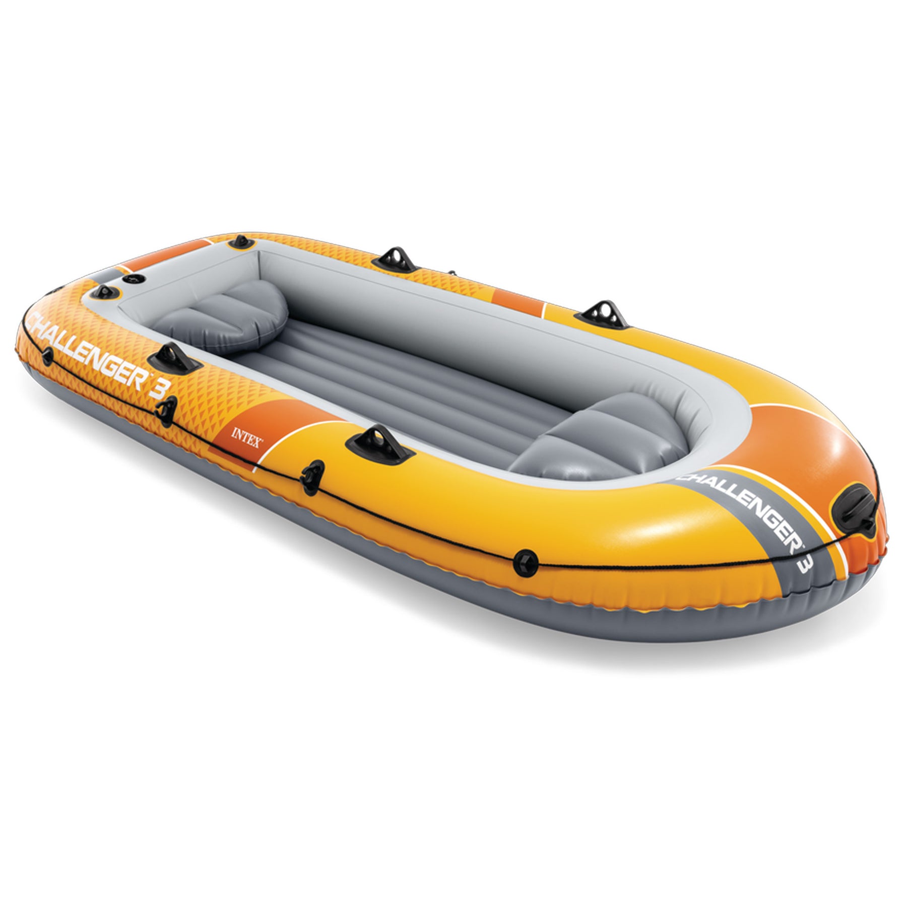 The INTEX Challenger 3 inflatable boat is perfect for boating fun for two adults. Whether fishing, relaxing, or rowing on the lake, this boat is great for making your adventure exciting and entertaining. Designed with heavy duty, puncture resistant PVC for comfort and durability, and an inflatable I-beam floor for rigidity, the boat contains three air chambers including an inner auxiliary chamber inside the main hull for extra safety. Inflating and deflating is a breeze with two quick-fill Boston valves. A grab handle on the bow and an all-around grab line are provided for your convenience, as well as welded oar locks, oar holders and a repair patch kit. Also included are two 54 inch boat oars and an INTEX high-output pump for inflating and deflating.