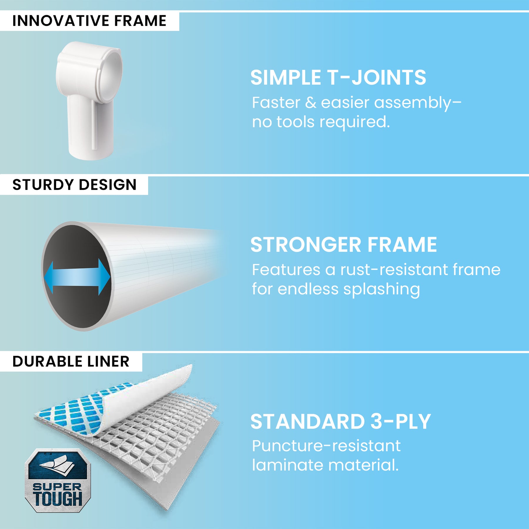 - Super-tough laminated sidewalls are reinforced with an all-around band to keep frame legs firmly in place while you splash and play outside
