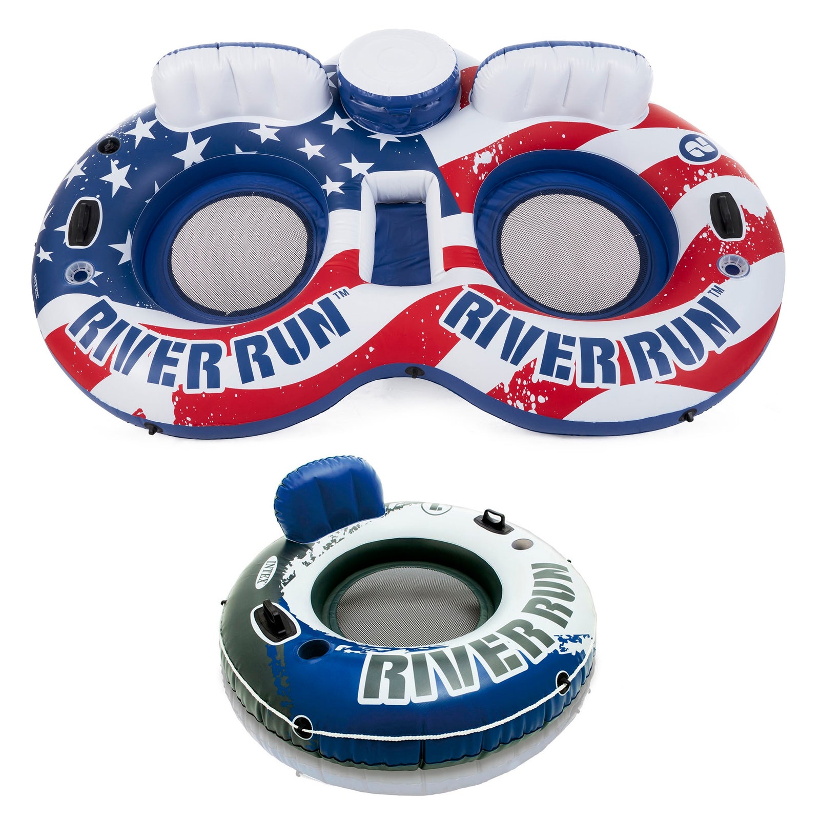 - Bundle includes Intex River Run II American Flag Inflatable 2-Person Tube Float and Intex River Run 1-Person Inflatable Tube River/Beach/Pool Raft