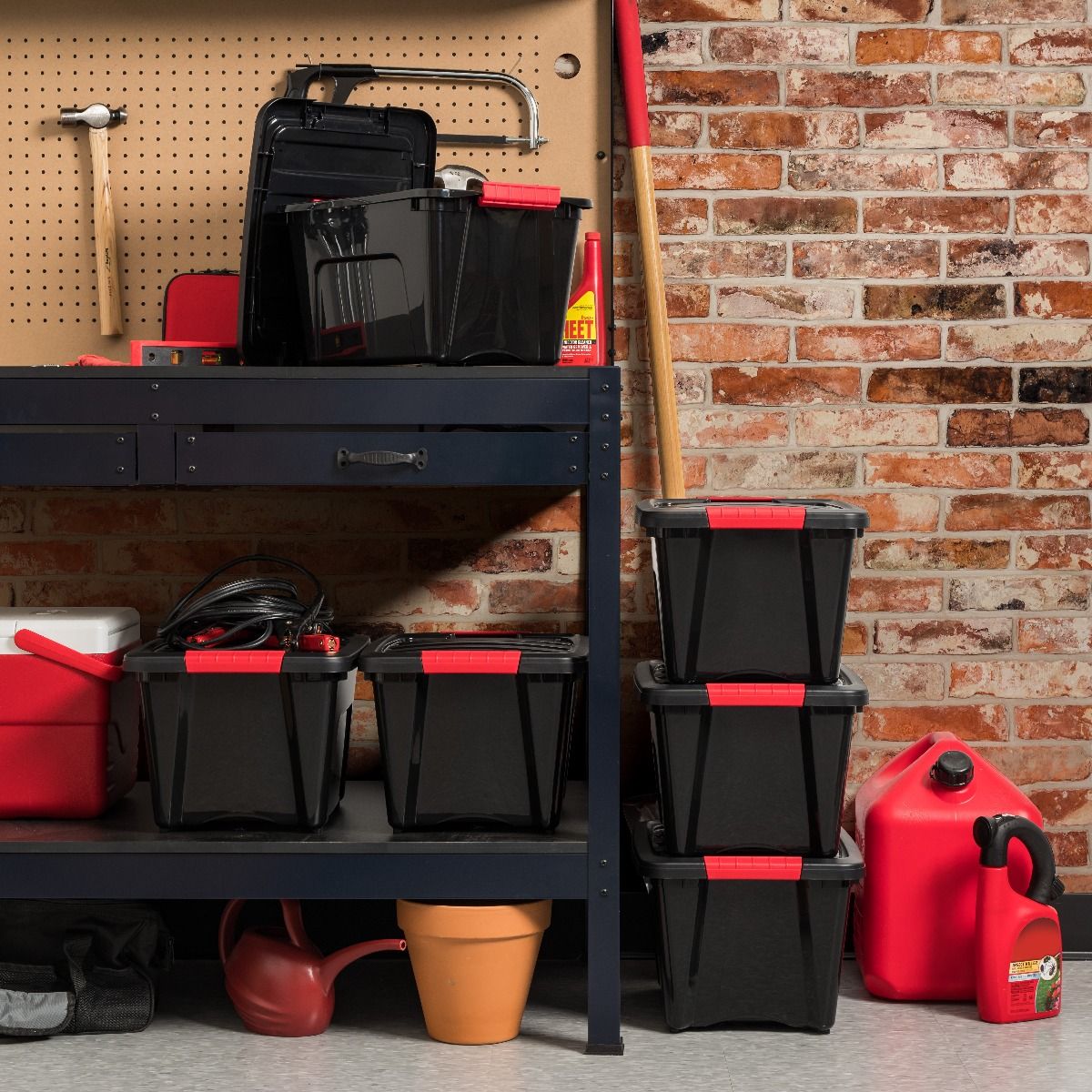 • Sturdy plastic bin with buckle up latches to keep items secure and dust free