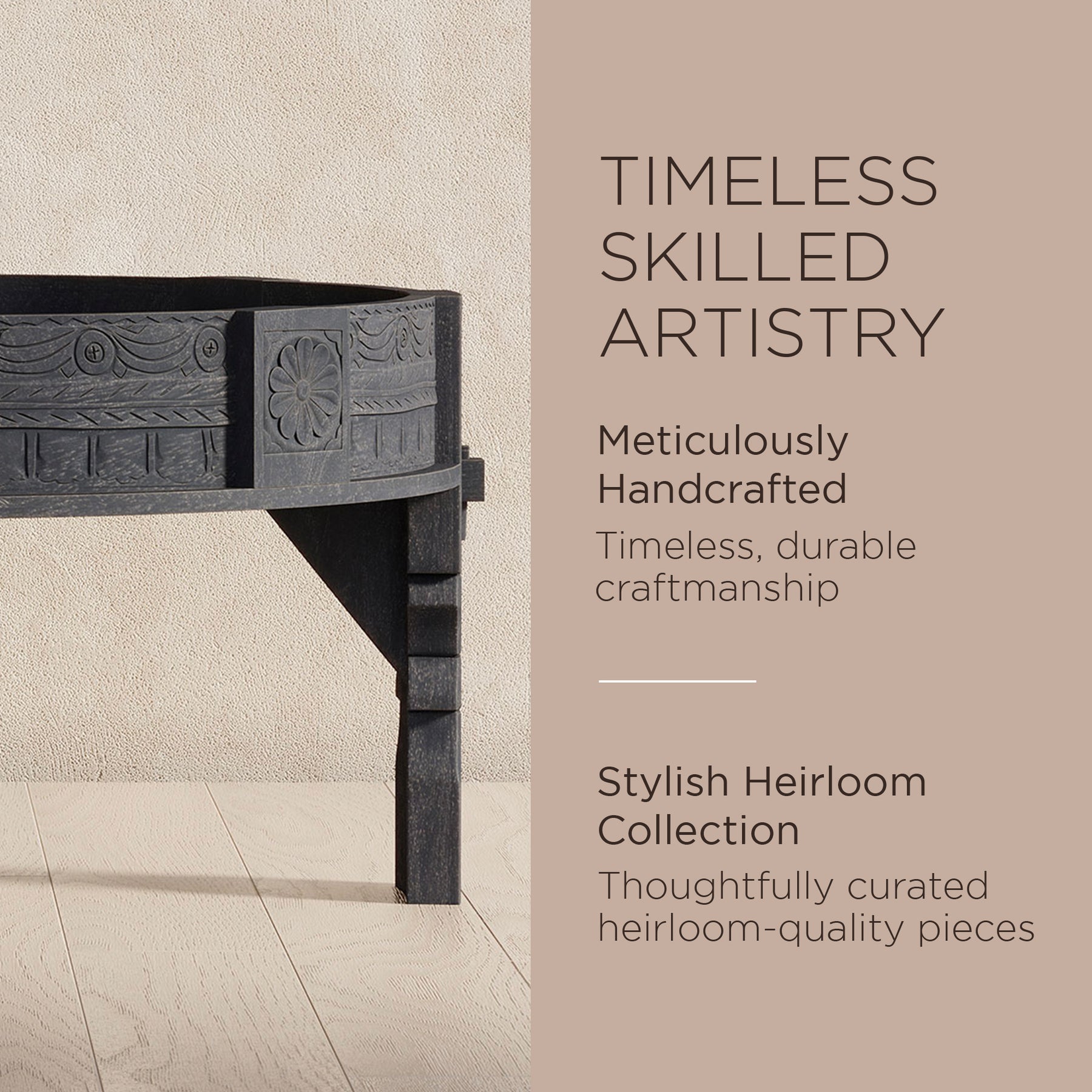 With a rich history and cultural significance, the hand-carved elements of our Jaya Round Coffee Table are intricate and beyond incredible. Transcending time with its hand-carved façade, spacious round tabletop, and metal accents, this large wood coffee table embodies the joy of owning bespoke creations crafted with love, passion, and expertise – a true testament to India’s legacy of extraordinary artistry. The warm tones and wood grain of the natural mango wood are a sight to behold, and the distressed wooden finish of our Jaya living room tables will give your space that one-of-a-kind, curated vibe. Simply style this cocktail table— and let this wooden table’s divine design do all the talking.