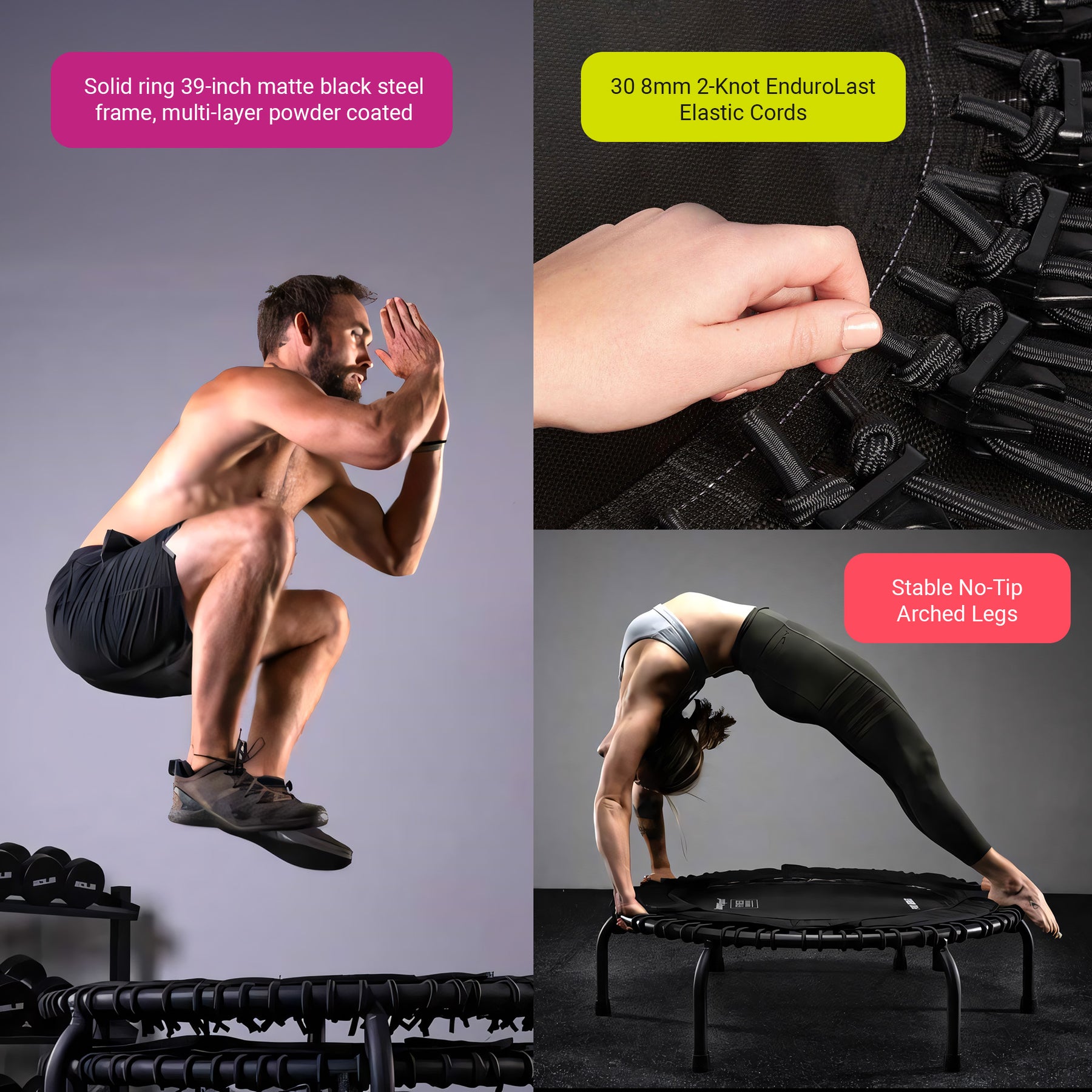 • The mat extension skirt and petal designs protect jumpers from stepping on the cords while the trampoline legs and 12.5-inch high frame are stable enough for push-ups, dips, and more