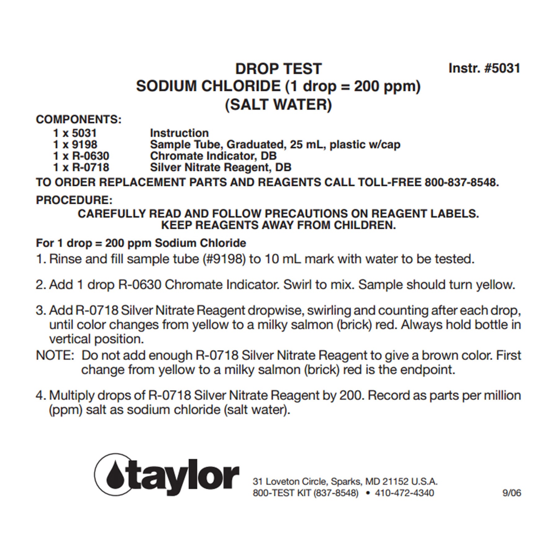 • Includes complete testing instructions, chromate indicator (0.75 ounces / R-0630), silver nitrate reagent (0.75 ounces / R-0718), and 25 mL graduated sample tube