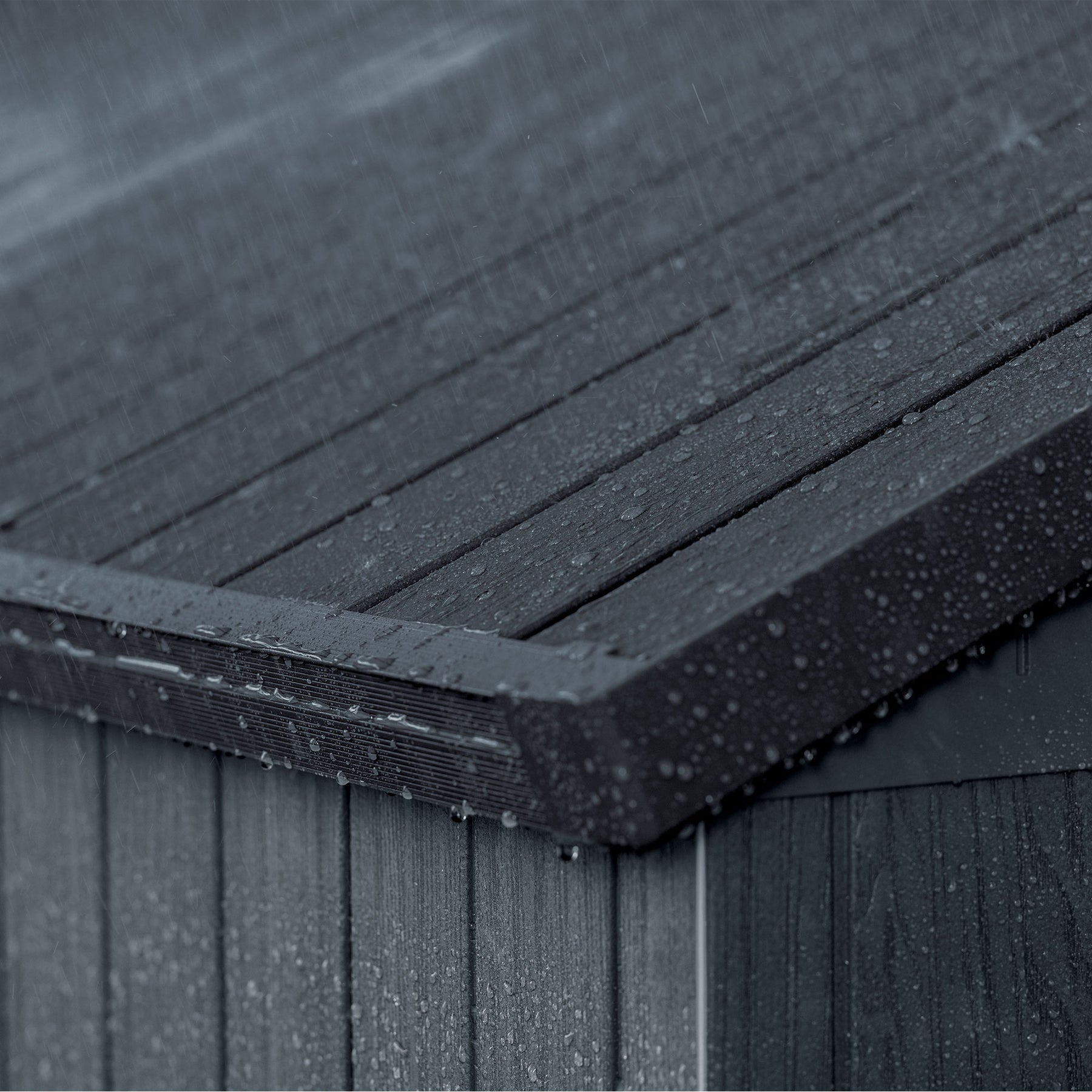 • Outdoor 6 x 8-foot storage shed made with weather-resistant plastic prohibits rust and decay