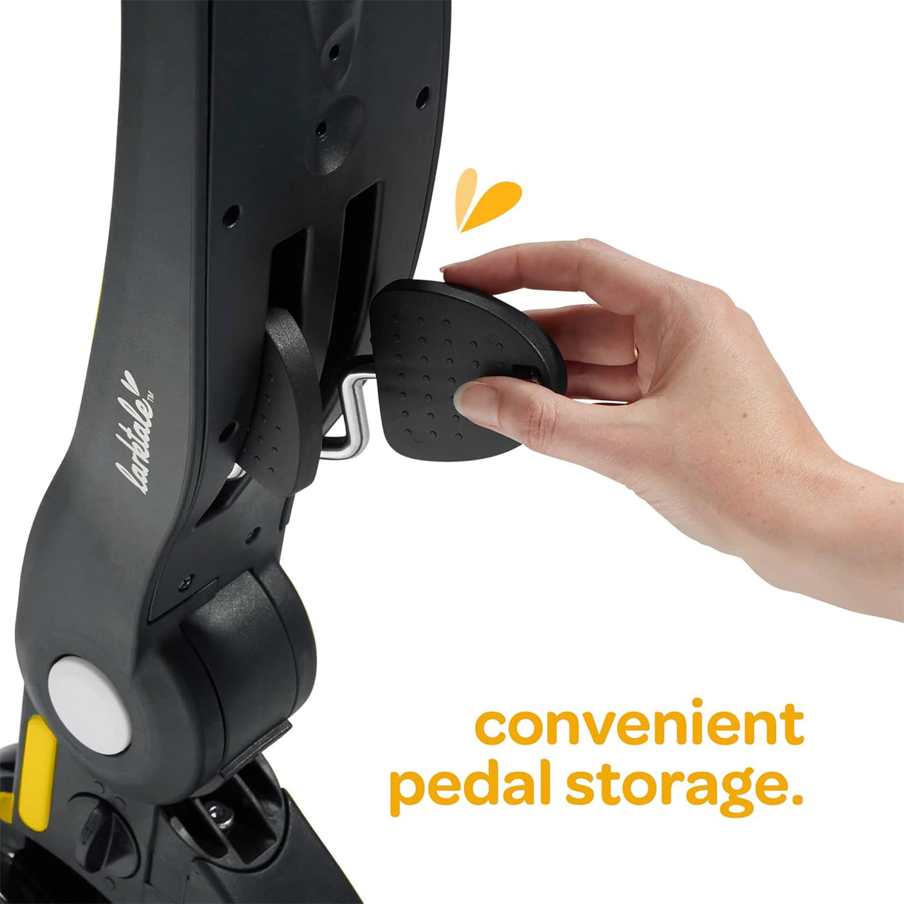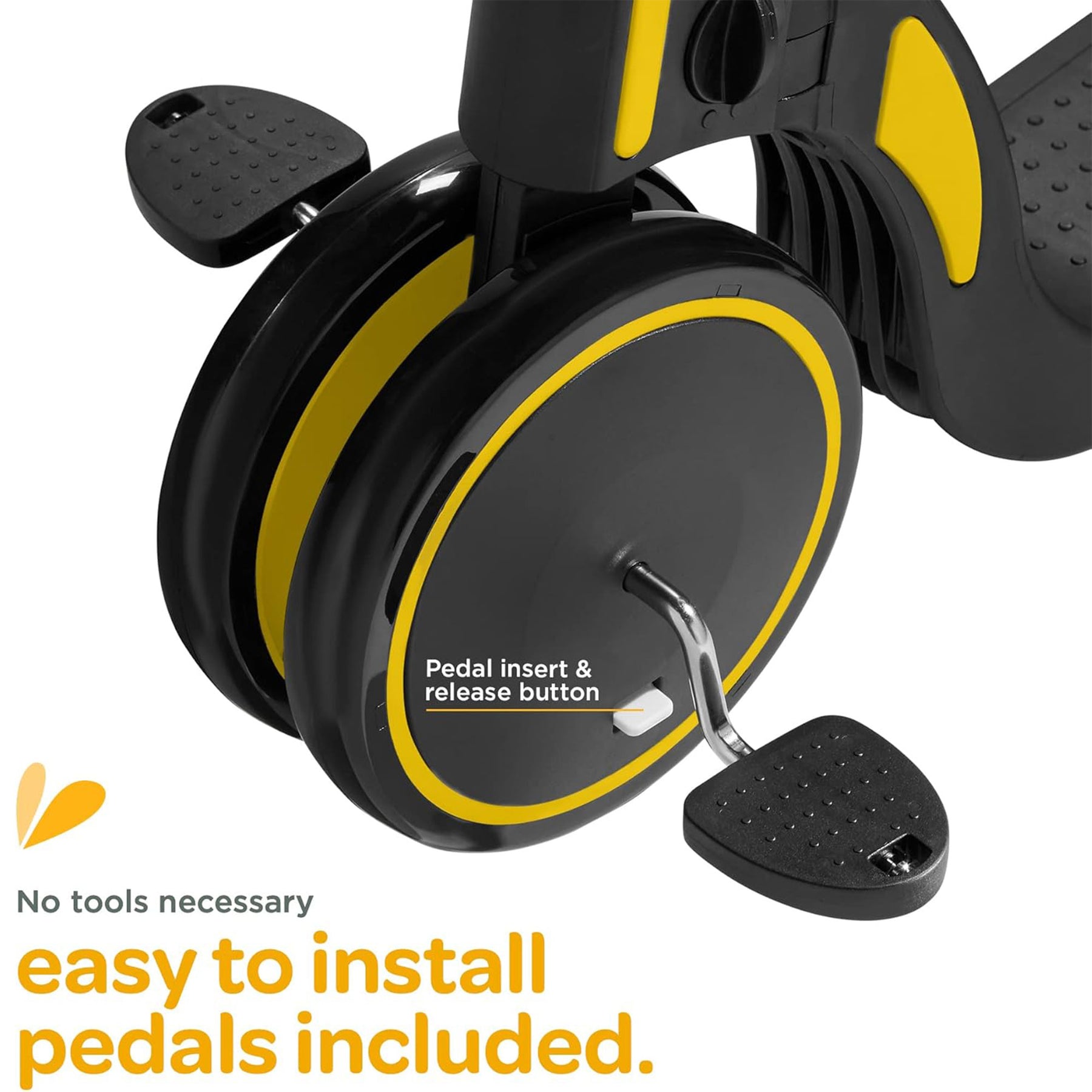 • Easily stores in small spaces when not in use; Pedals can be quickly attached or removed and stowed away