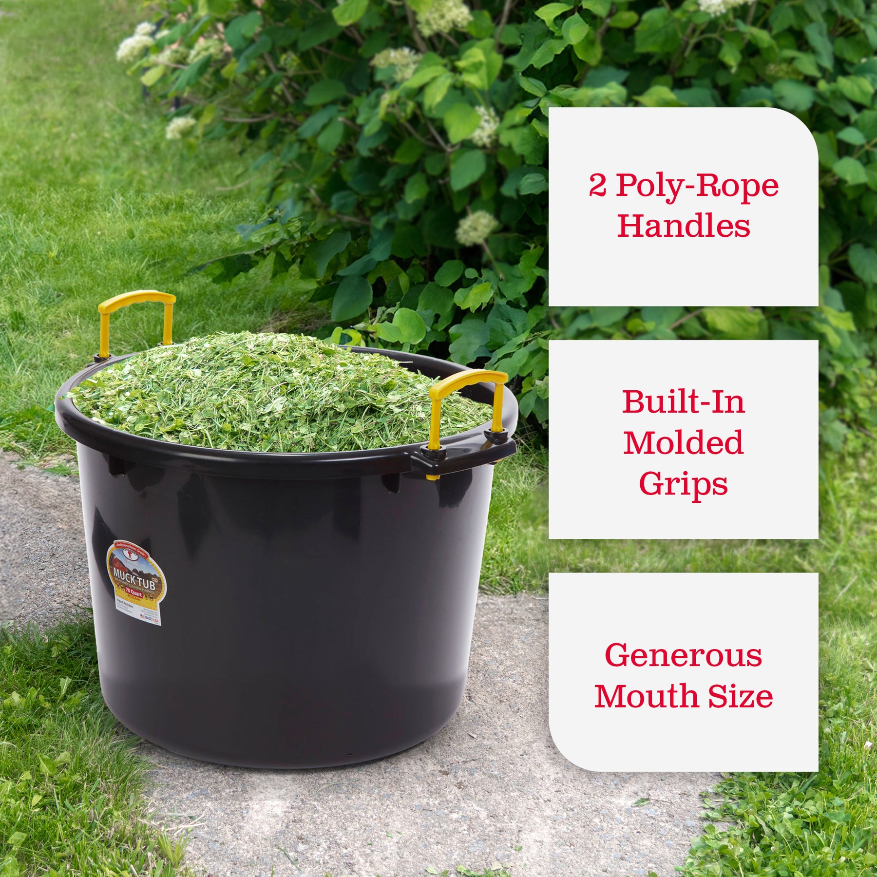 - Multi-purpose 70-quart plastic tote bucket ideal for mucking, barn cleanup, and gardening