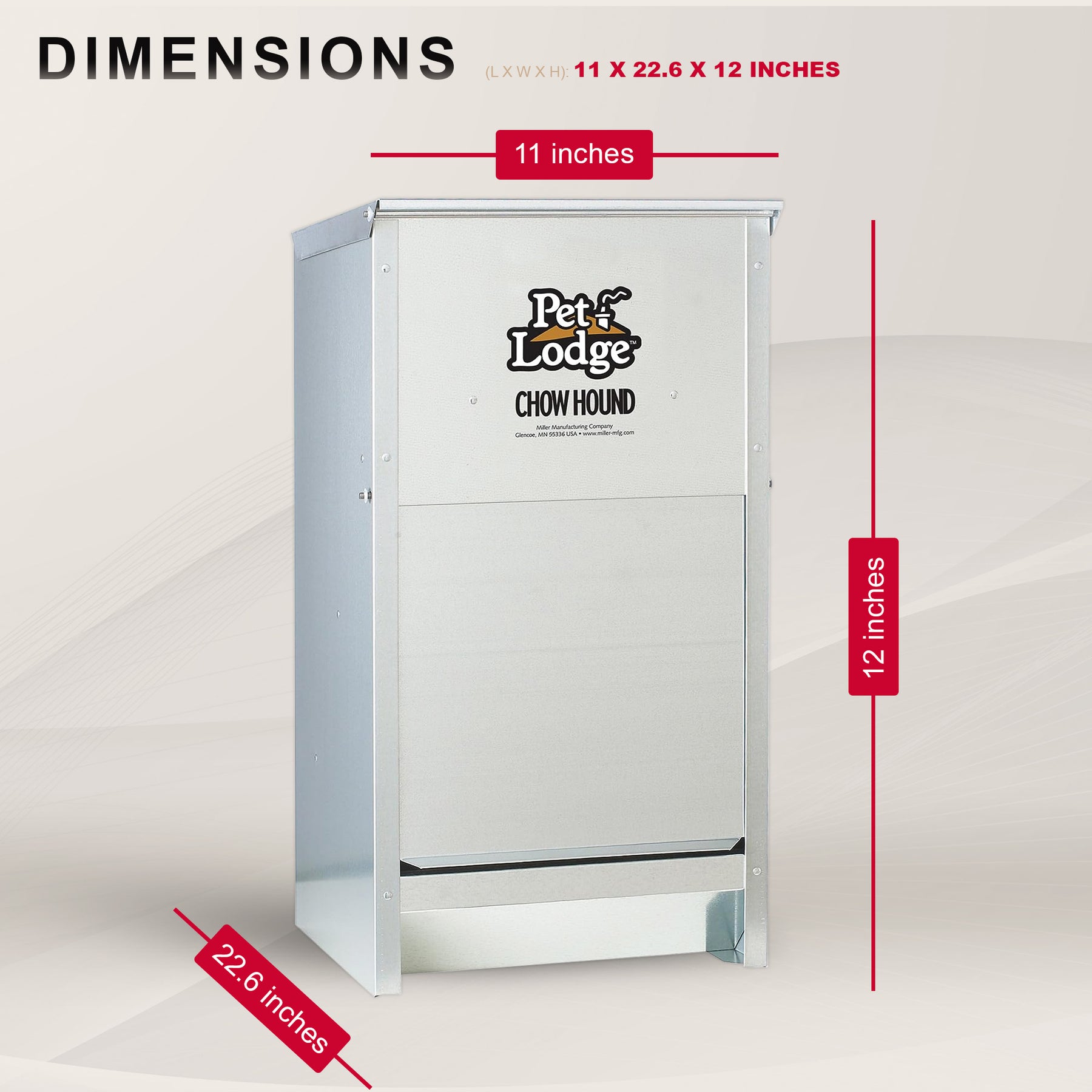 You and your dog never had this easy. Safely store dry dog food and feed it from the same chew-proof container. The Chow Hound Automatic Dog Feeder is manufactured from tough galvanized steel for durability and rust resistance. The magnetized door stays shut until your dog nudges it open, keeping unwanted pests out. A specially angled chute provides a steady food flow on demand. Food stays fresh, dry, and pest free. The feeder can be mounted on a wall by the backside keyholes or frame (not included). The Automatic Pet Feeder comes fully assembled and can hold 25 pounds of dry dog food.