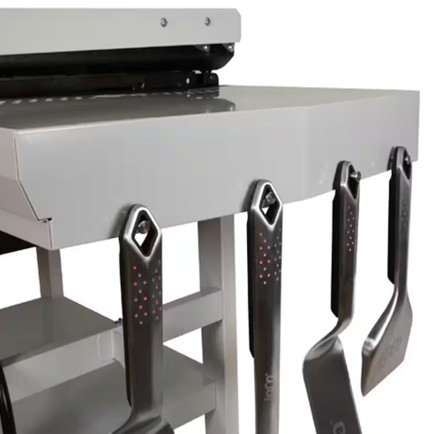 - Grill has built-in side shelves, 4 utensil pegs, and a full storage shelf for optimal storage