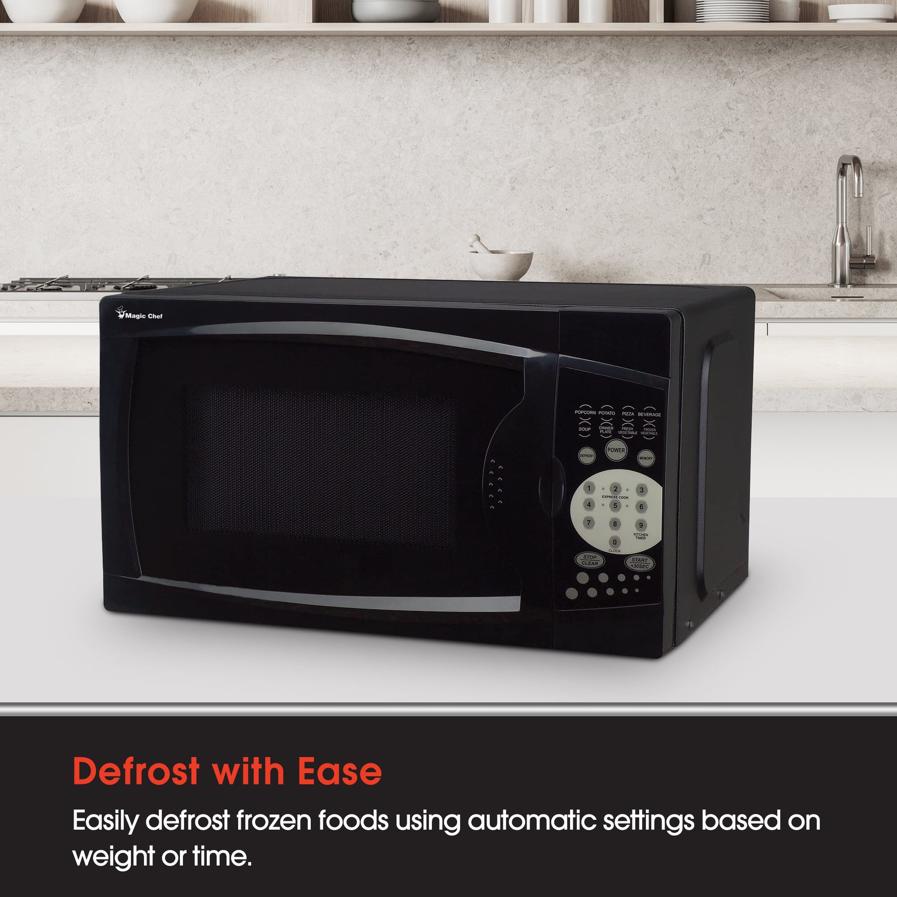This microwave oven has 8 preprogrammed cooking modes and a rotating glass turntable for even cooking results. This microwave also has a convenient auto-defrost feature that can be used via weight or time. That gives you options for defrosting your frozen foods.