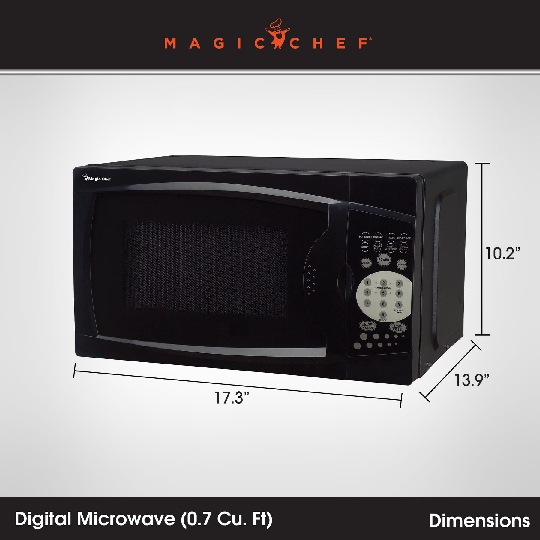 • 0.7 cubic foot countertop microwave oven with digital touch controls and choice of 10 power levels