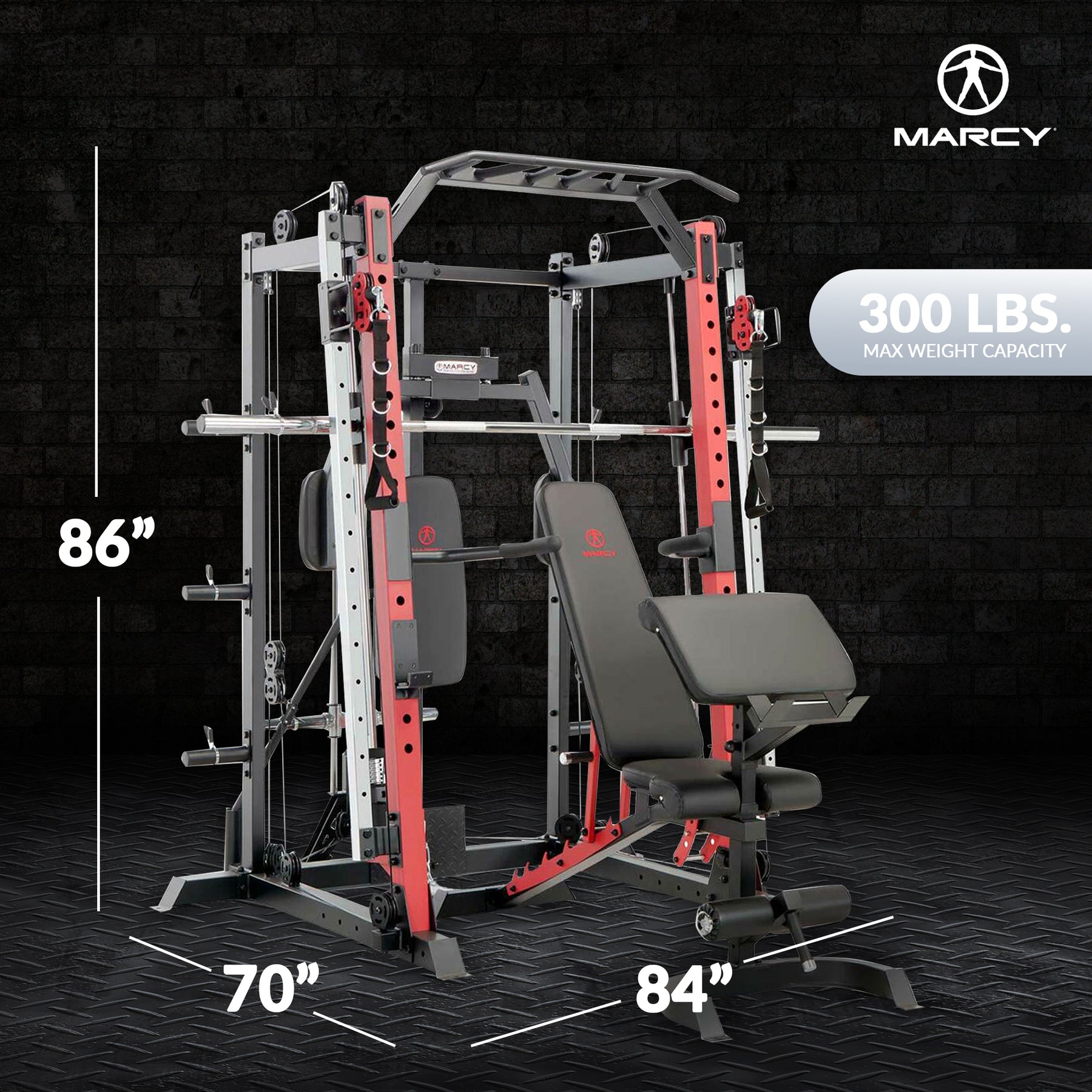The SM-4033 has a maximum user weight capacity of 300 pounds. With the Marcy Smith Machine Cage System, experience the same functionality of equipment in your commercial gym and train like a pro in your multi-station exercise machine.