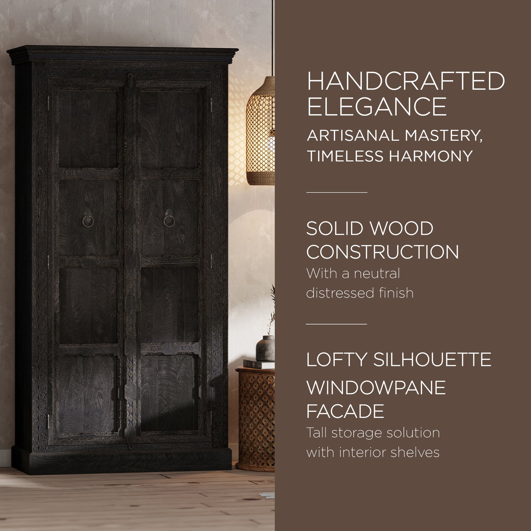 • With a lofty silhouette and windowpane facade, our Mahala Cabinet is a tall storage solution with interior shelves, ideal for storing items you'd like tidily tucked away