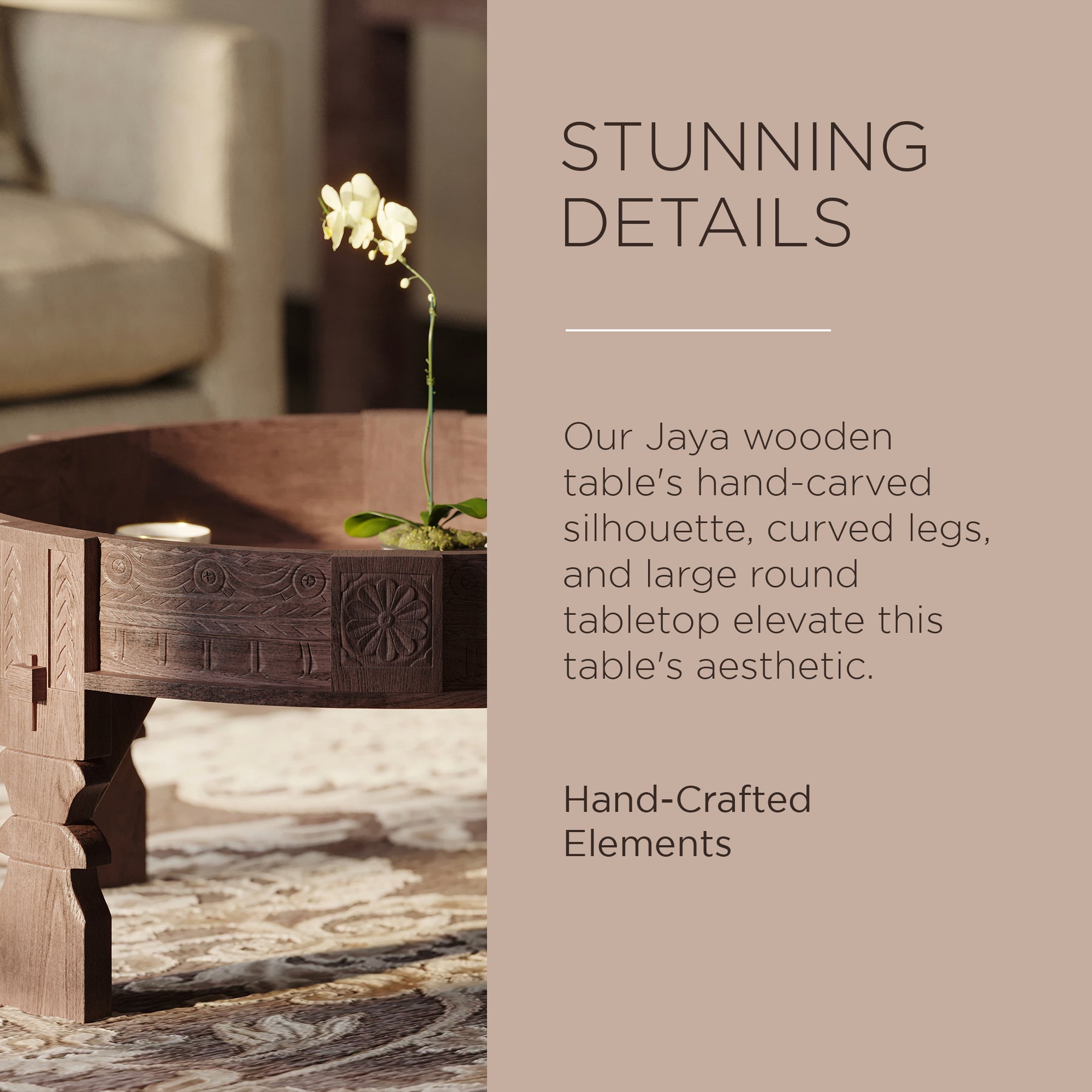 • Our Jaya wooden table's hand-carved silhouette, curved legs, and large round tabletop elevate this table's aesthetic