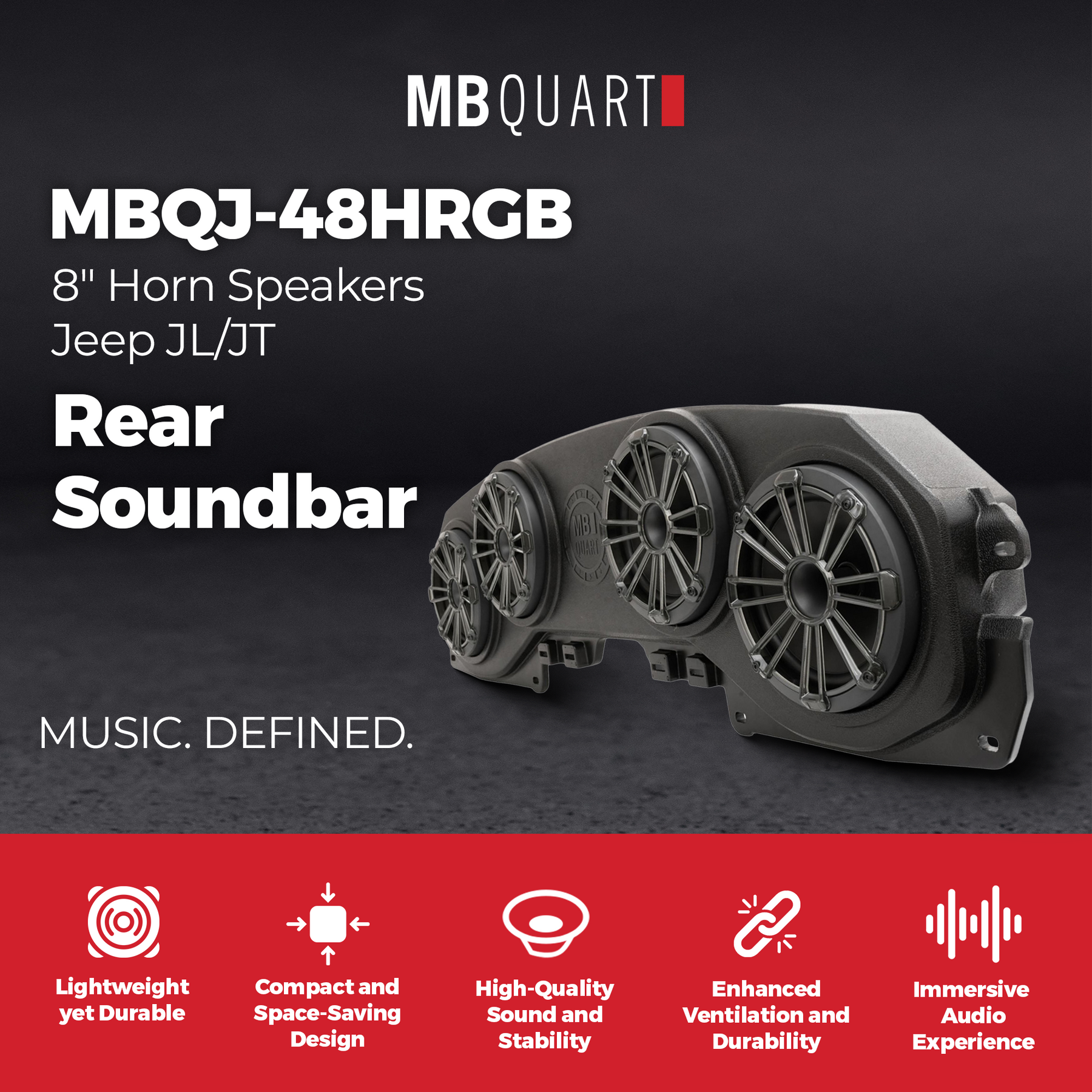 Upgrade your Jeep’s audio experience with the MB Quart MBQJ-48HRGB Rear Soundbar, engineered specifically for Jeep Wrangler JL (2018+) and Gladiator JT (2020+) models. Designed as a direct replacement for the factory rear soundbar, this system delivers powerful sound while fitting seamlessly into your Jeep’s interior. With plug-and-play OEM-style harnesses and a lightweight composite enclosure, installation is quick and simple with no custom fabrication required.