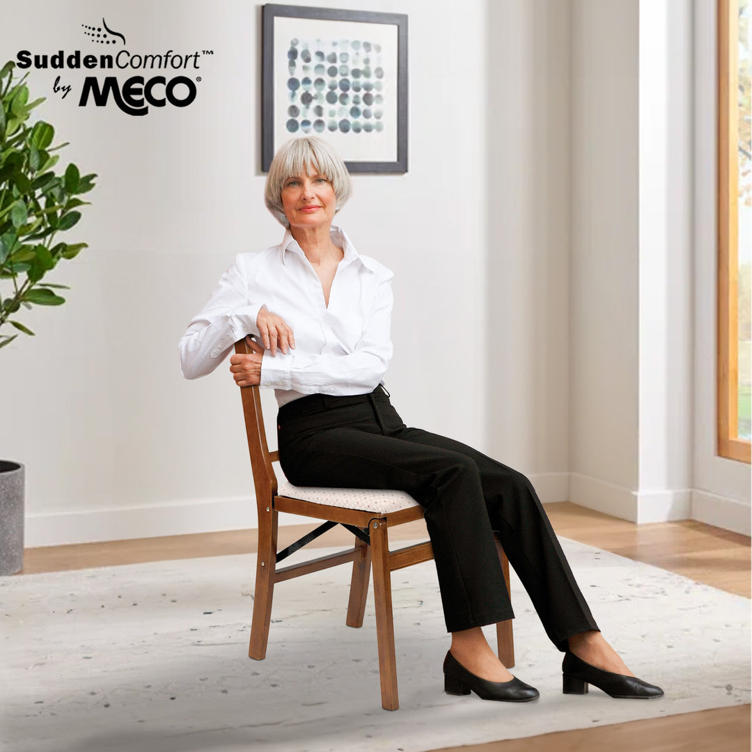 You don't need to worry about making your guest list for your next gathering a bit longer from now on. Whether you need extra seating for guests or a convenient option for everyday use, these Stakmore Urn Premium Solid Wood Dining Table Folding Chair Set with Fabric Padded Upholstered Seat from MECO is a versatile and stylish choice that will improve the look and functionality of any home.