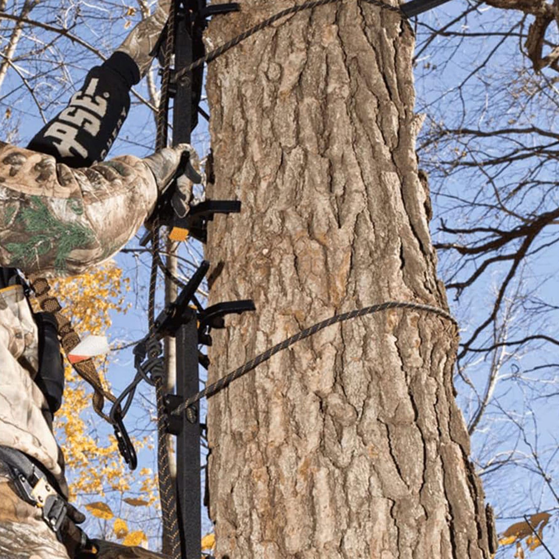 Silence, safety, and stability are essential when it comes to hunting. Accomplish all 3 with this portable tree climbing system. Equipped with safety and assembly hardware, you're guaranteed to reach your tree stand in no time using this convenient climber. Heavy-duty rigid steel construction supports up to 300 pounds.
