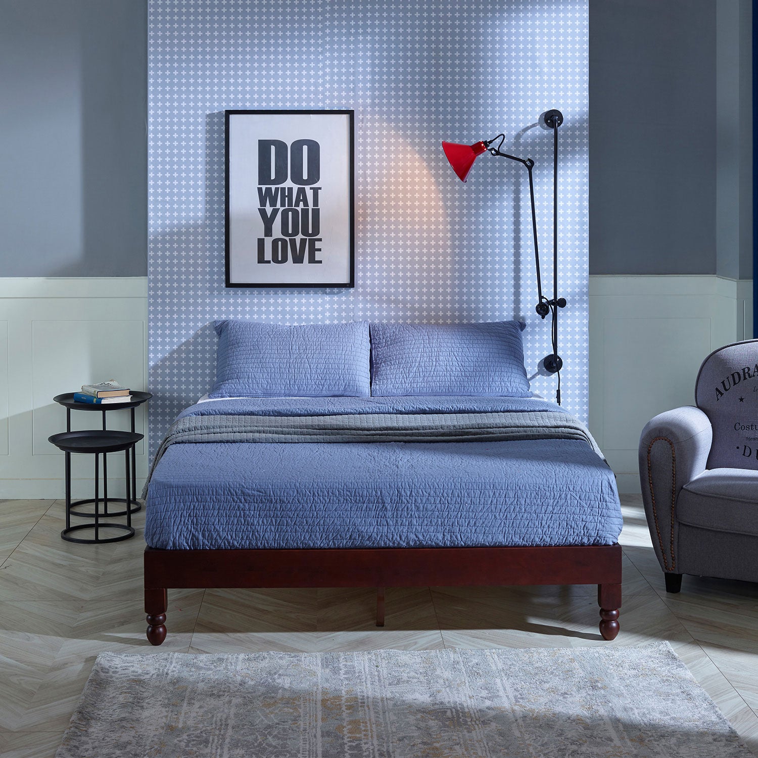 This twin-sized platform bed frame measures 79.4 inches long, 59.4 inches wide, and 12 inches tall. Easily climb into bed with this low bed frame.