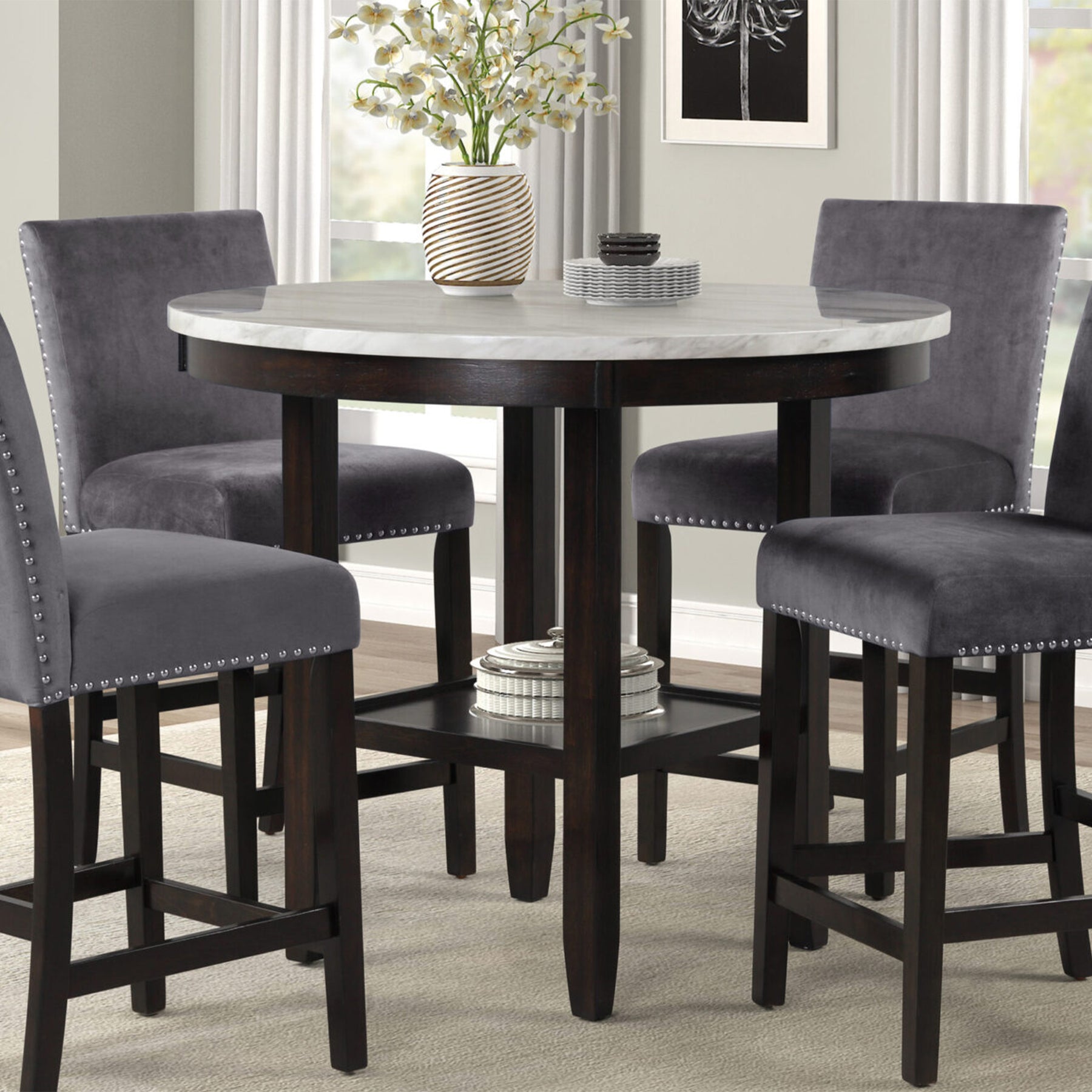 Indulge in the luxurious appeal of the Celeste 42-Inch Faux Marble Round Counter Table from New Classic Furniture. Wrapped in a rich Espresso finish, this round counter table emanates sophistication and elegance from every angle. Boasting a durable construction, this round counter table features a faux marble top that mimics the appearance of real marble, adding an exquisite touch of luxury to any space.