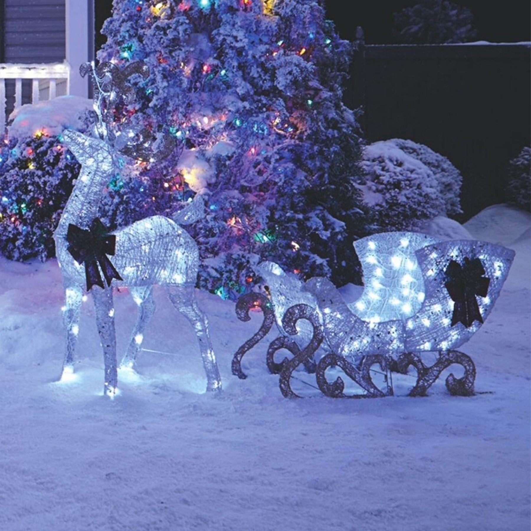 • Create a winter wonderland display with this reindeer and sleigh holiday decor set
