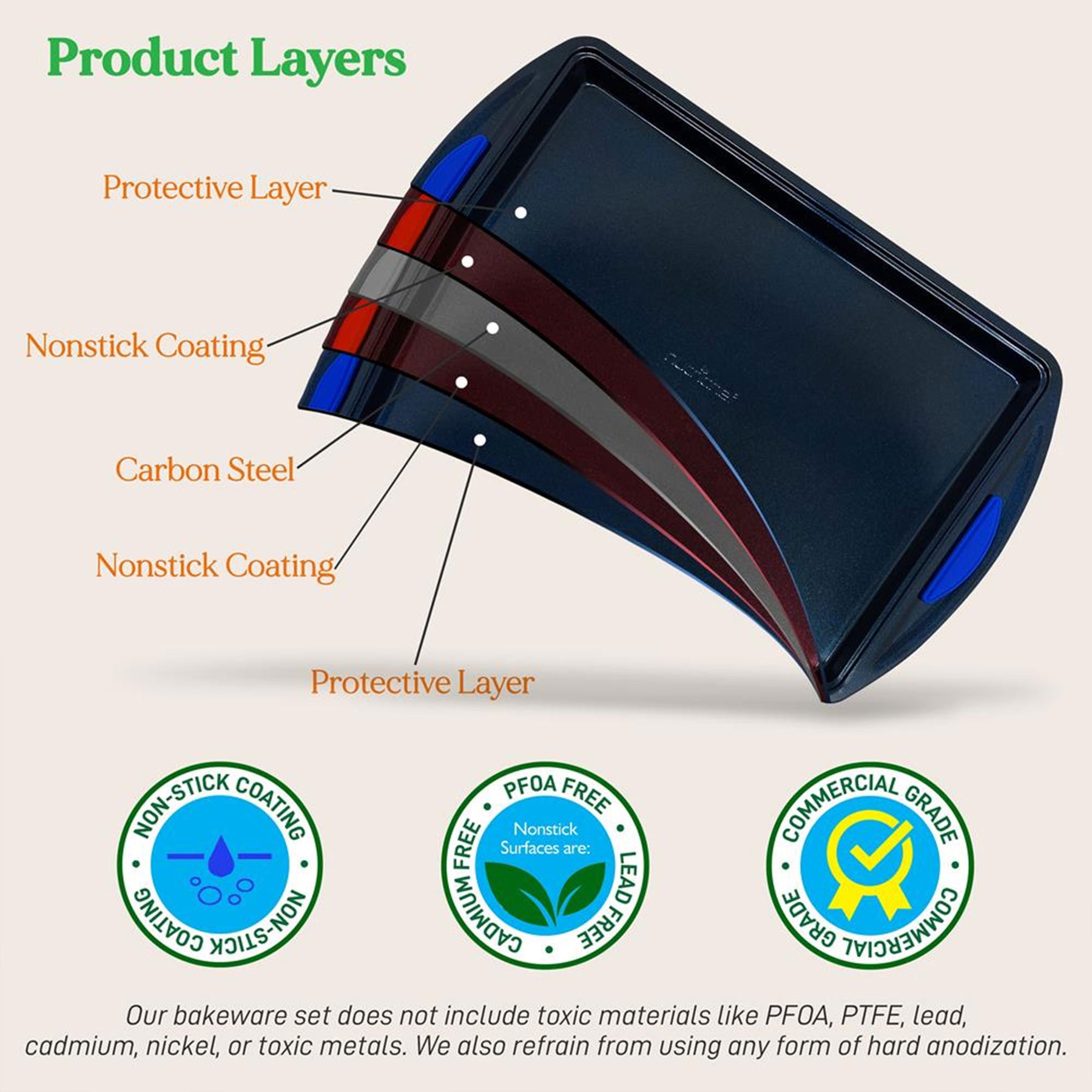 Get ready for your own great bake-off with the NutriChef 10 Piece Carbon Steel Bakeware Set. Each piece is constructed of carbon steel and covered in an eco-friendly non-stick coating. Heat-resistant silicone inserts on the handles make the journey from oven to table safe and easy.