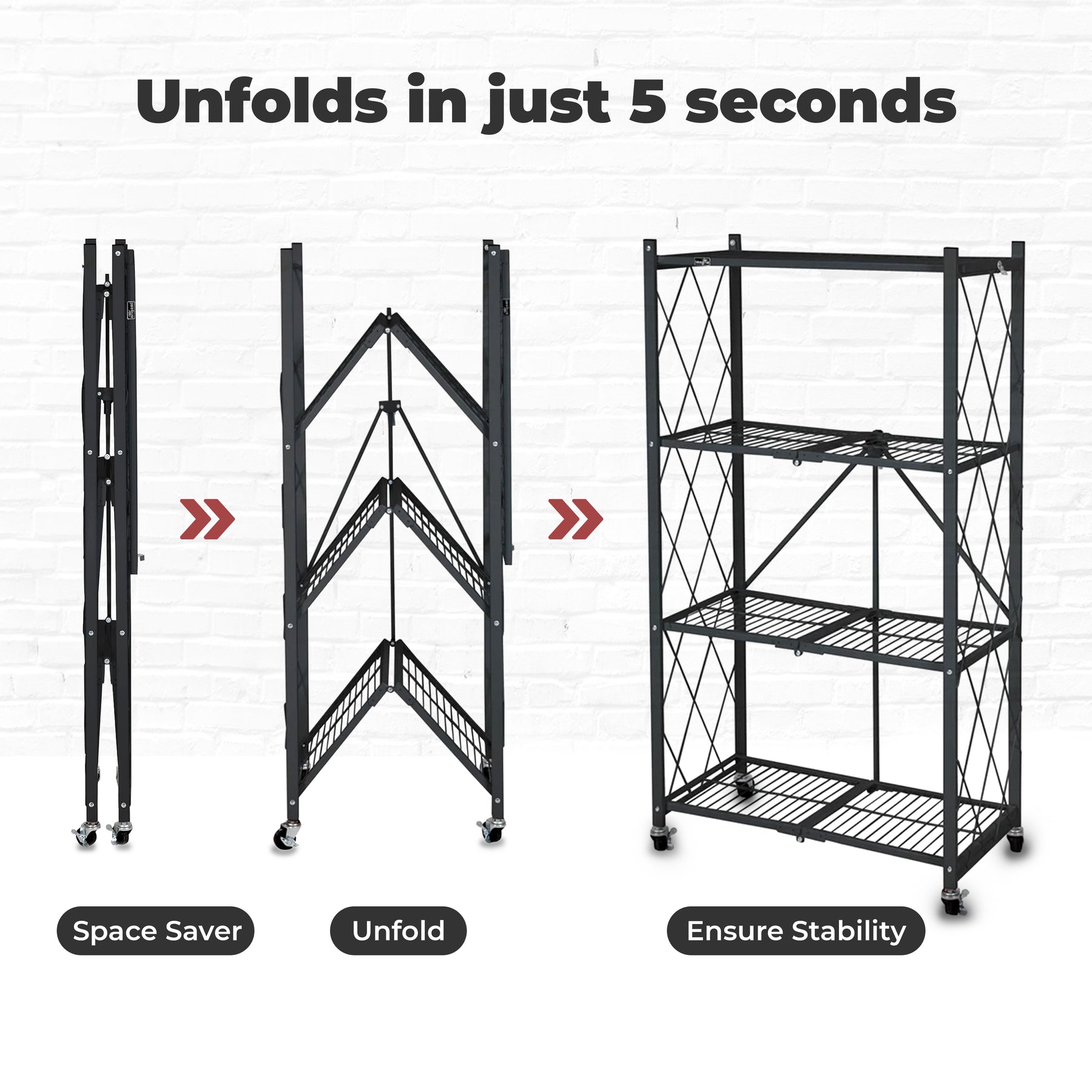 - Shelf unit unfolds in just 5 seconds, providing instant organization for your garage, warehouse, or garden storage needs