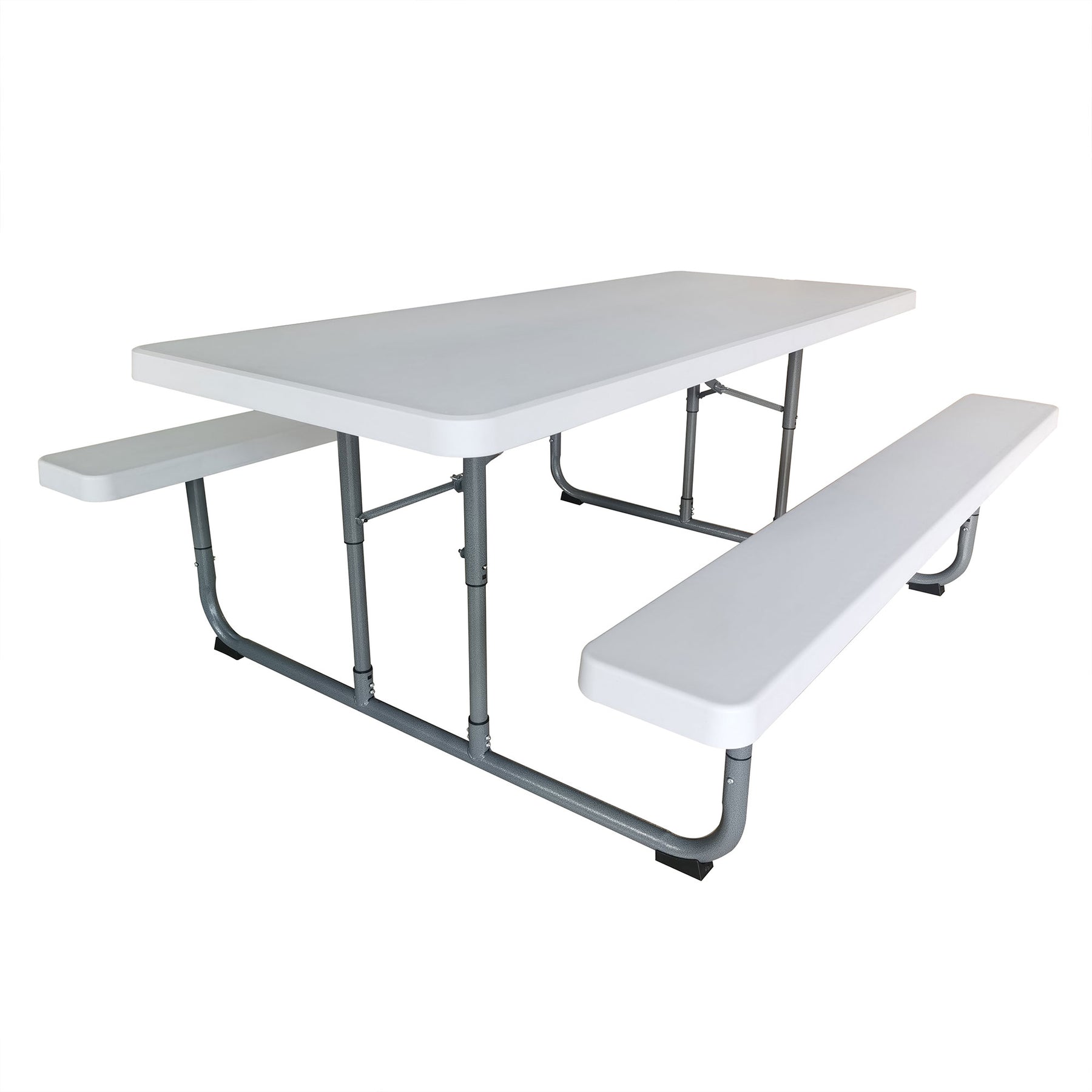 • Spacious 6-foot table surface with attached benches to accommodate 6 people easily
