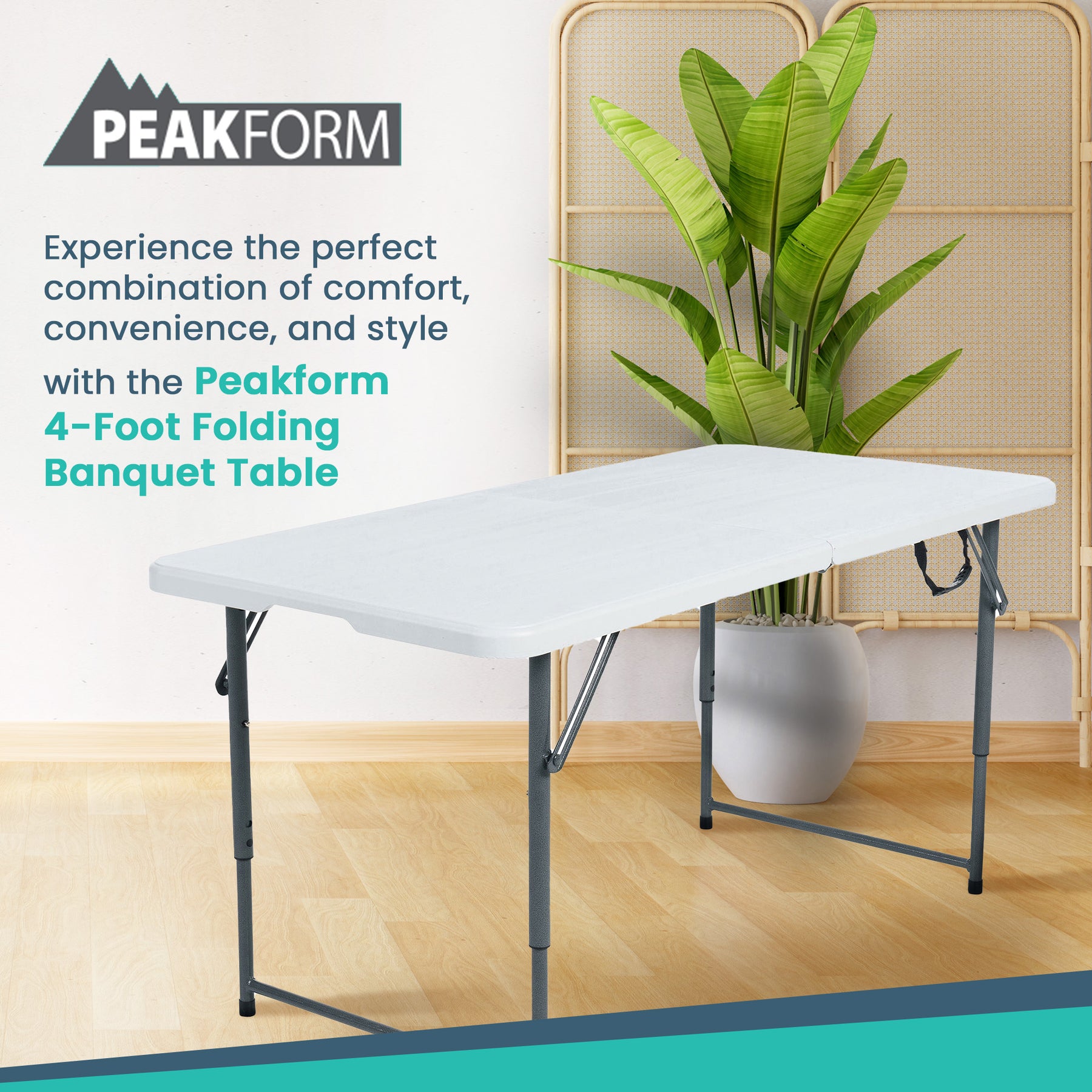 Upgrade your convenience and style with the Peakform 4-Foot Folding Banquet Table, the ultimate choice for anyone seeking a practical, portable, and enduring table solution. Enjoy the ideal blend of functionality and durability, making every occasion special. From casual family gatherings to formal events, this table adapts to your needs, providing a reliable surface that enhances your activities.