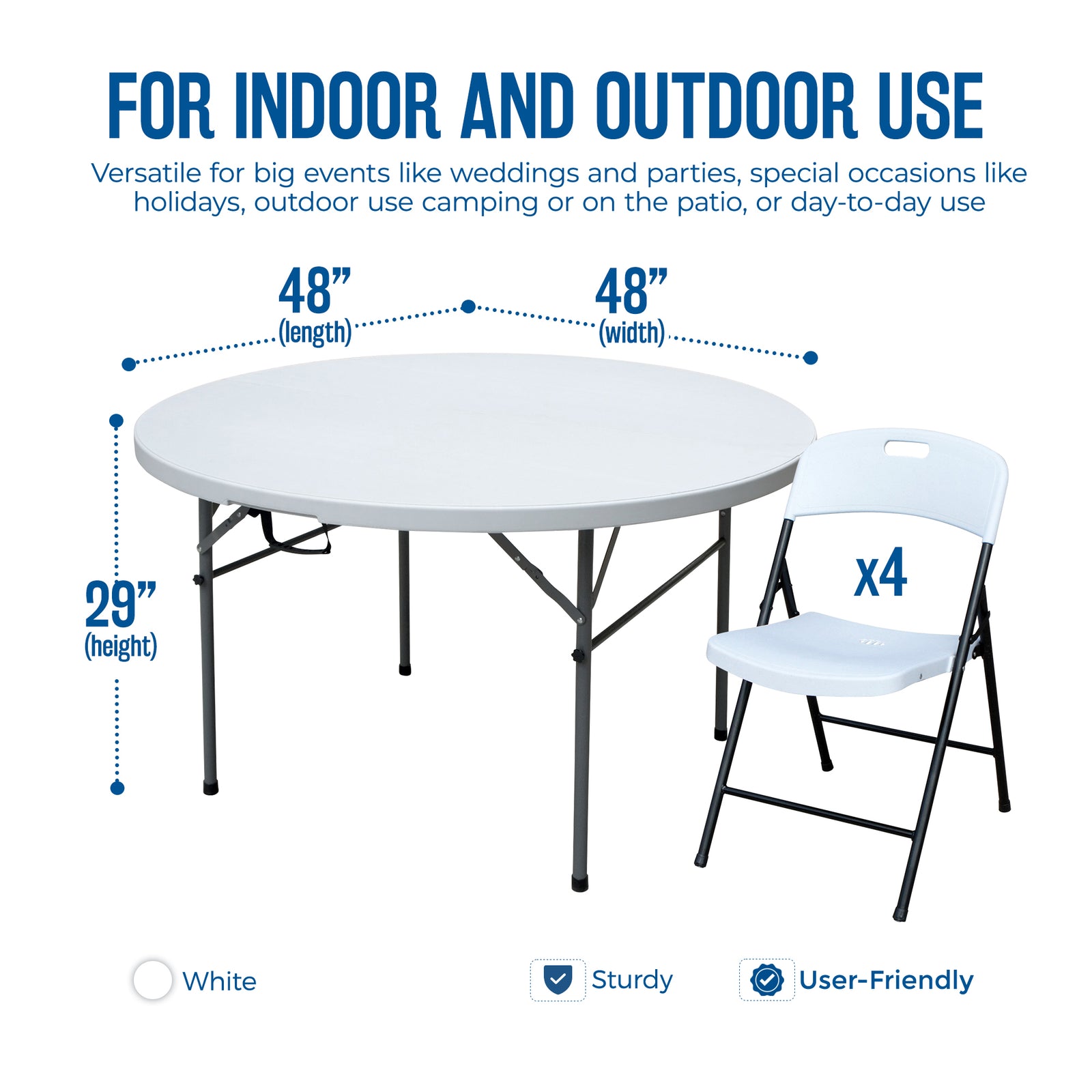 - Seat 4 people around the folding table comfortably; measures 48 inches (4 feet) in diameter and 29 inches tall