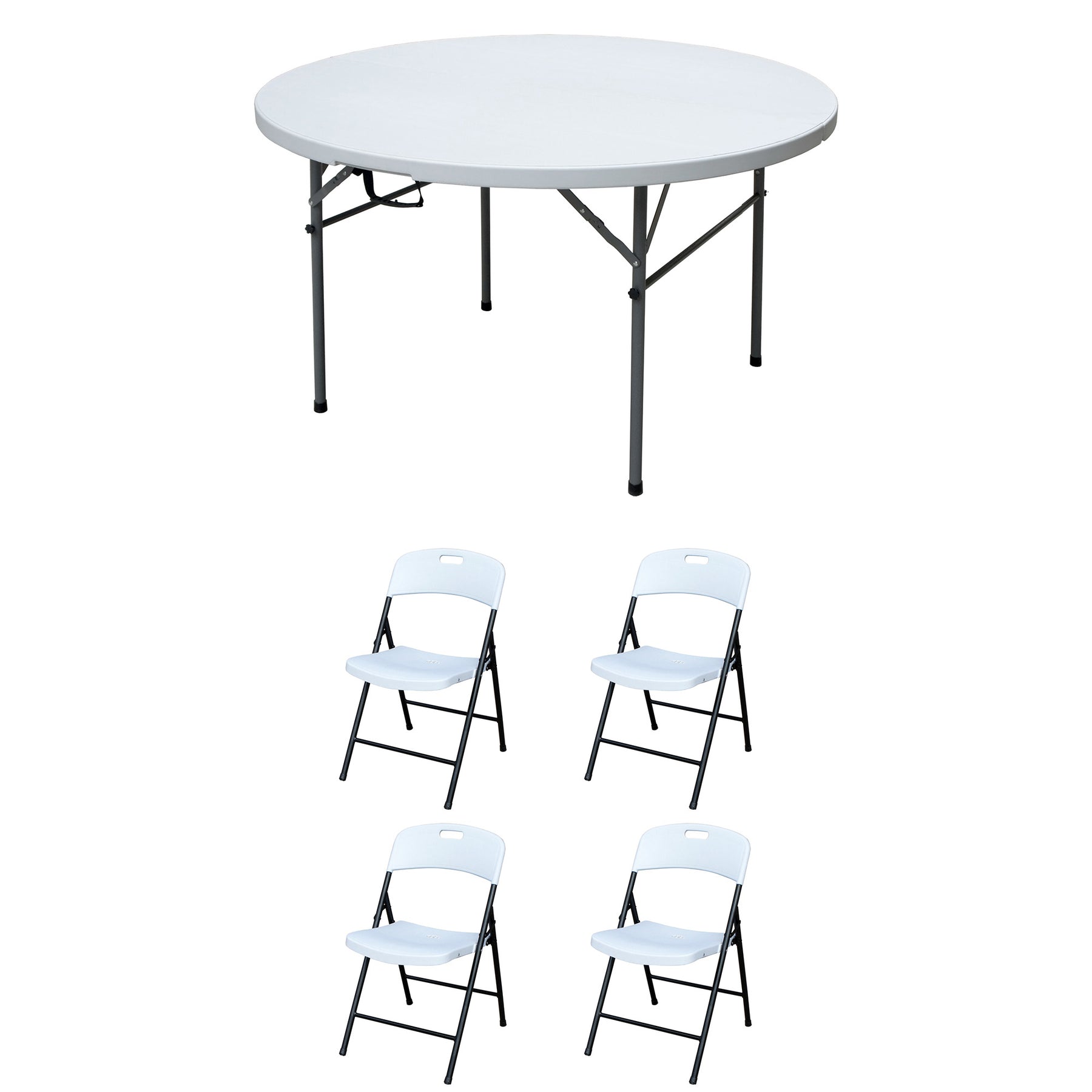 - Package includes Plastic Development Group 4 Foot Round Fold In Half Folding Banquet Table, White and Plastic Development Group Outdoor Plastic Folding Party Chair, White (4 Pack)