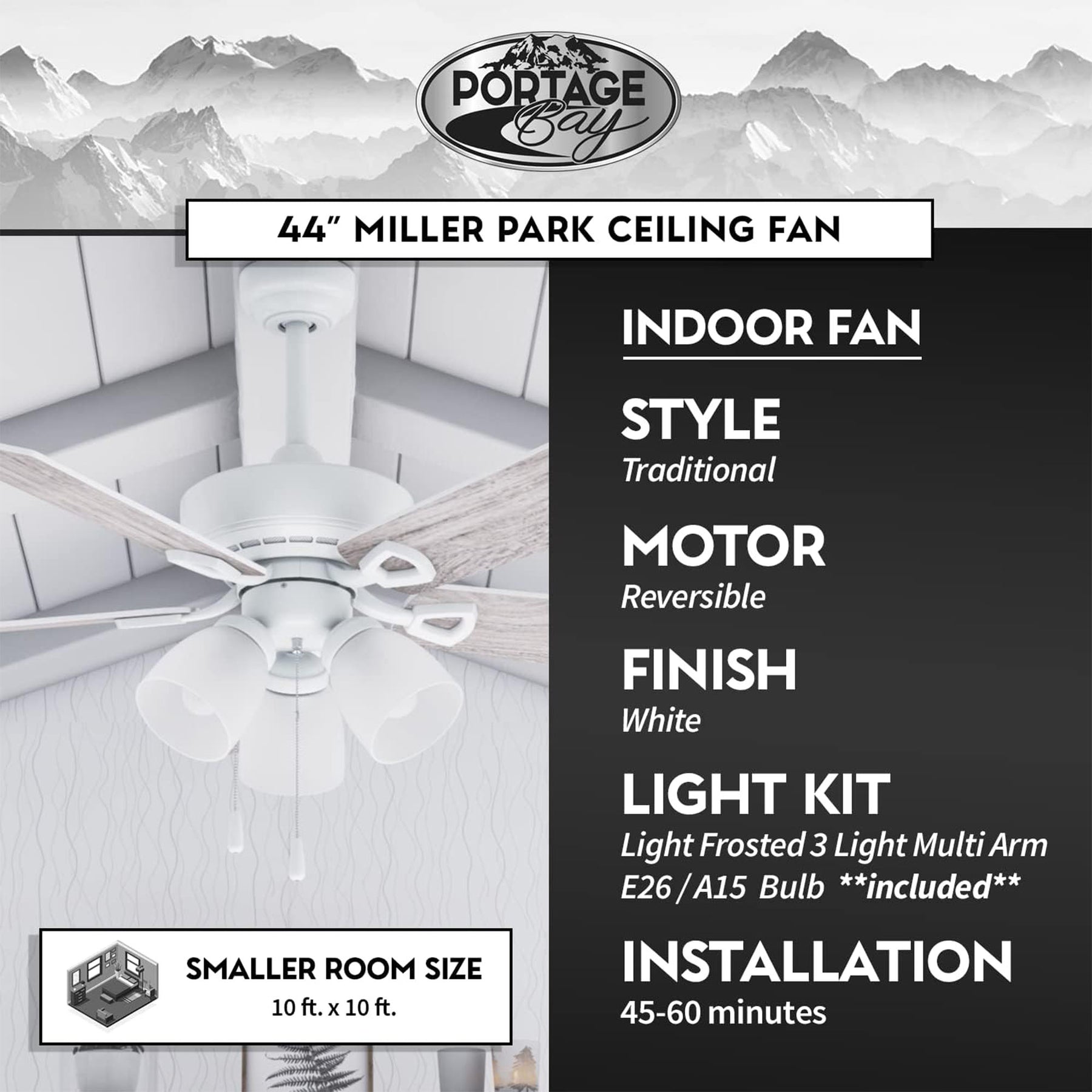 This 44-Inch Miller Park Ceiling Fan with a quiet, reversible motor is the perfect addition to any room, providing a peaceful indoor environment year-round. The 3-speed reversible motor offers versatile performance, keeping you cool in the summer and circulating warm air in the winter to help reduce energy costs. Ideal for spaces up to 350 square feet, it’s perfect for living rooms, bedrooms, dining rooms, and family rooms.