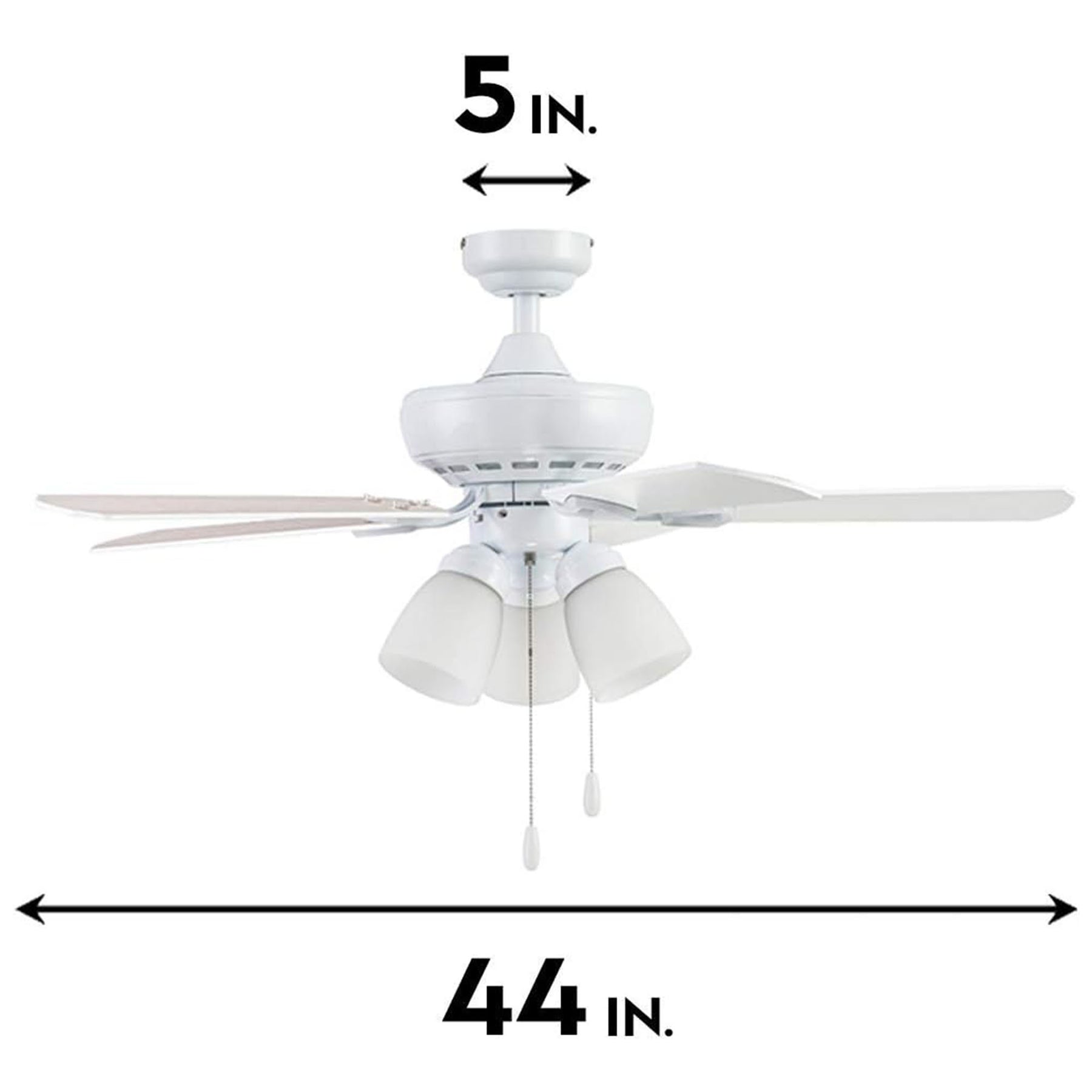 With a pull chain control for easy operation, this fan is crafted from a combination of wood, glass, and metal in a sleek white finish. The fan measures 44 inches long, making it a compact and stylish solution for medium-sized rooms. Installation can be completed in 45 to 60 minutes.