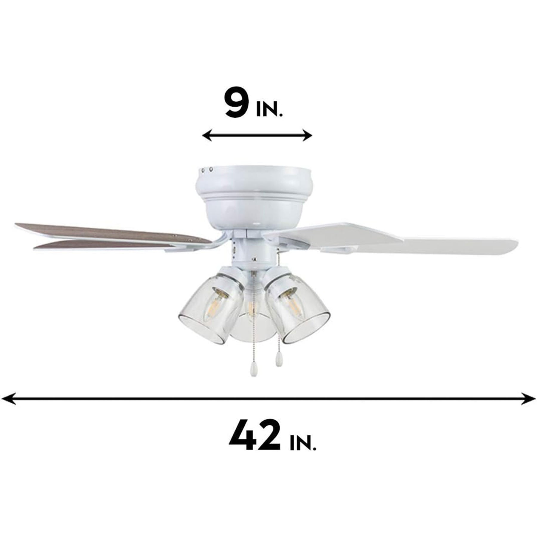 With a pull chain control for easy operation, this fan is crafted from a combination of wood, glass, and metal in a sleek white finish. The fan measures 42 inches long, making it a compact and stylish solution for medium-sized rooms. Installation can be completed in 45 to 60 minutes.